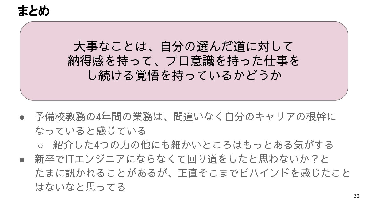 まとめ • 予備校教務の4年間の業務は、間違いなく自分のキャリアの根幹に なっていると感じている ◦ 紹介した4つの力の他にも細かいところはもっとある気がする • 新卒でITエンジニアにならなくて回り道をしたと思わないか?と たまに訊かれることがあるが、正直そこまでビハインドを感じたこと はないなと思ってる