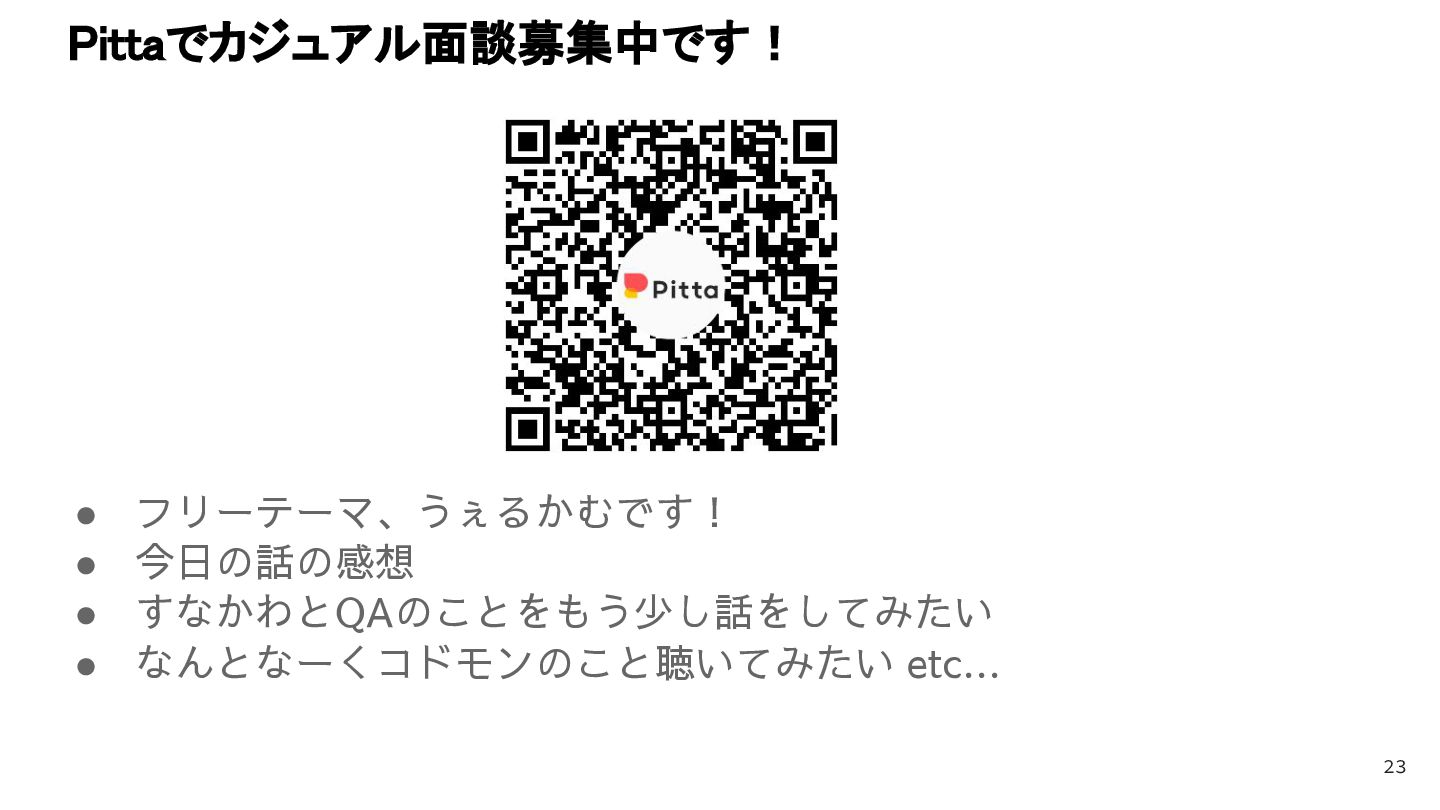 Pittaでカジュアル面談募集中です! • フリーテーマ、うぇるかむです! • 今日の話の感想 • すなかわとQAのことをもう少し話をしてみたい • なんとなーくコドモンのこと聴いてみたい