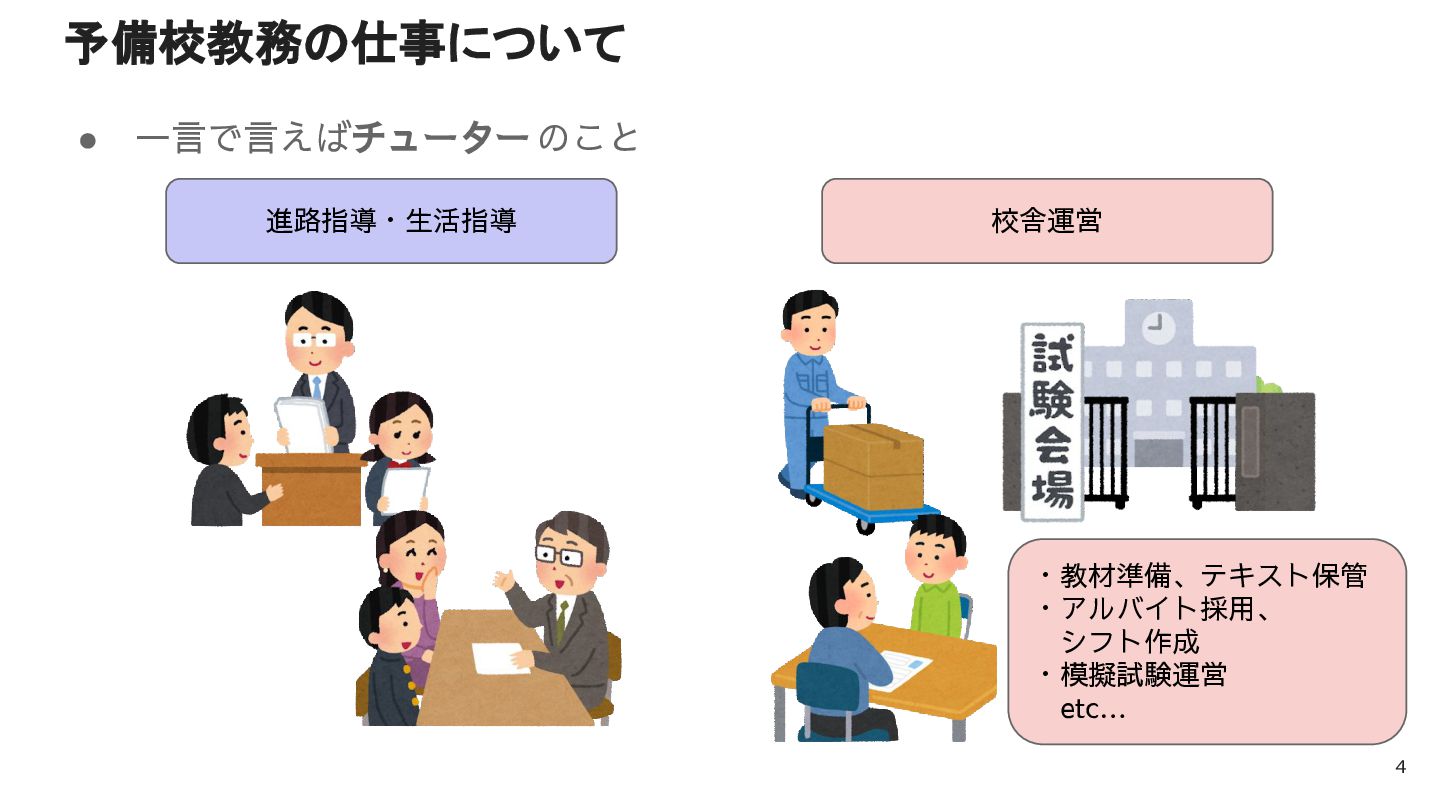 予備校教務の仕事について • 一言で言えばチューター のこと 進路指導・生活指導 校舎運営 ・教材準備、テキスト保管 ・アルバイト採用、 シフト作成