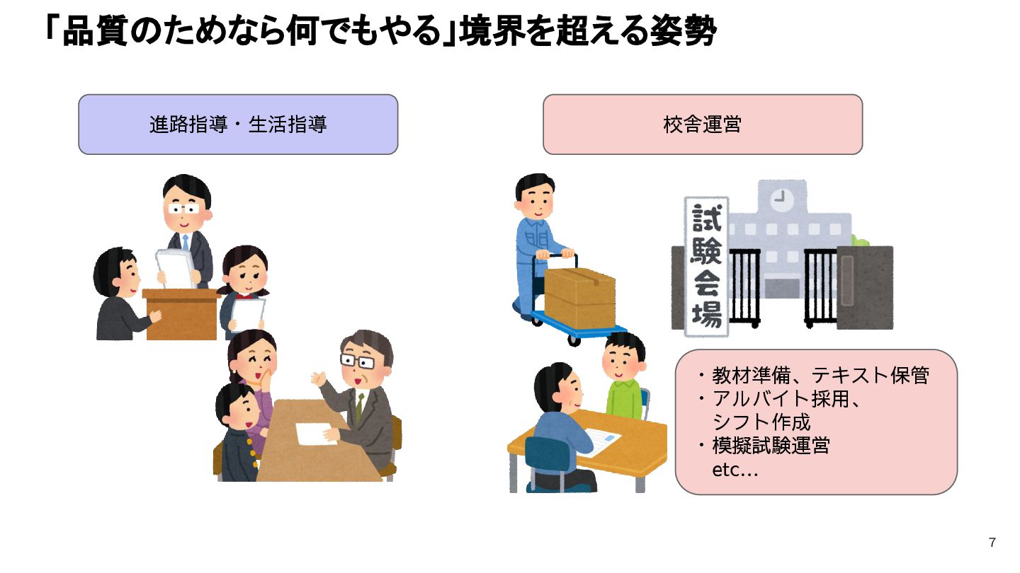 「品質のためなら何でもやる」境界を超える姿勢 進路指導・生活指導 校舎運営 ・教材準備、テキスト保管 ・アルバイト採用、 シフト作成 ・模擬試験運営 etc… 生徒1人1人の合格のために、