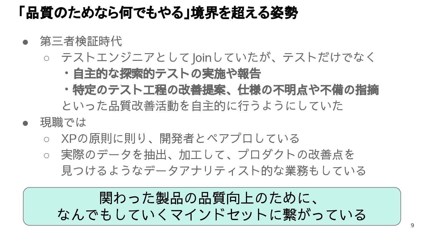 「品質のためなら何でもやる」境界を超える姿勢 • 第三者検証時代 ◦ テストエンジニアとしてJoinしていたが、テストだけでなく ・自主的な探索的テストの実施や報告 ・特定のテスト工程の改善提案、仕様の不明点や不備の指摘 といった品質改善活動を自主的に行うようにしていた •