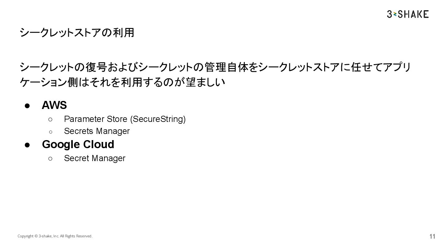 Manager • Google Cloud ◦ Secret Manager Copyright © 3-shake, Inc. All Rights Reserved. シークレットストアの利用 11