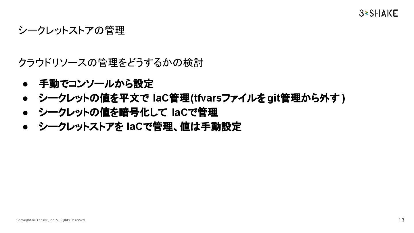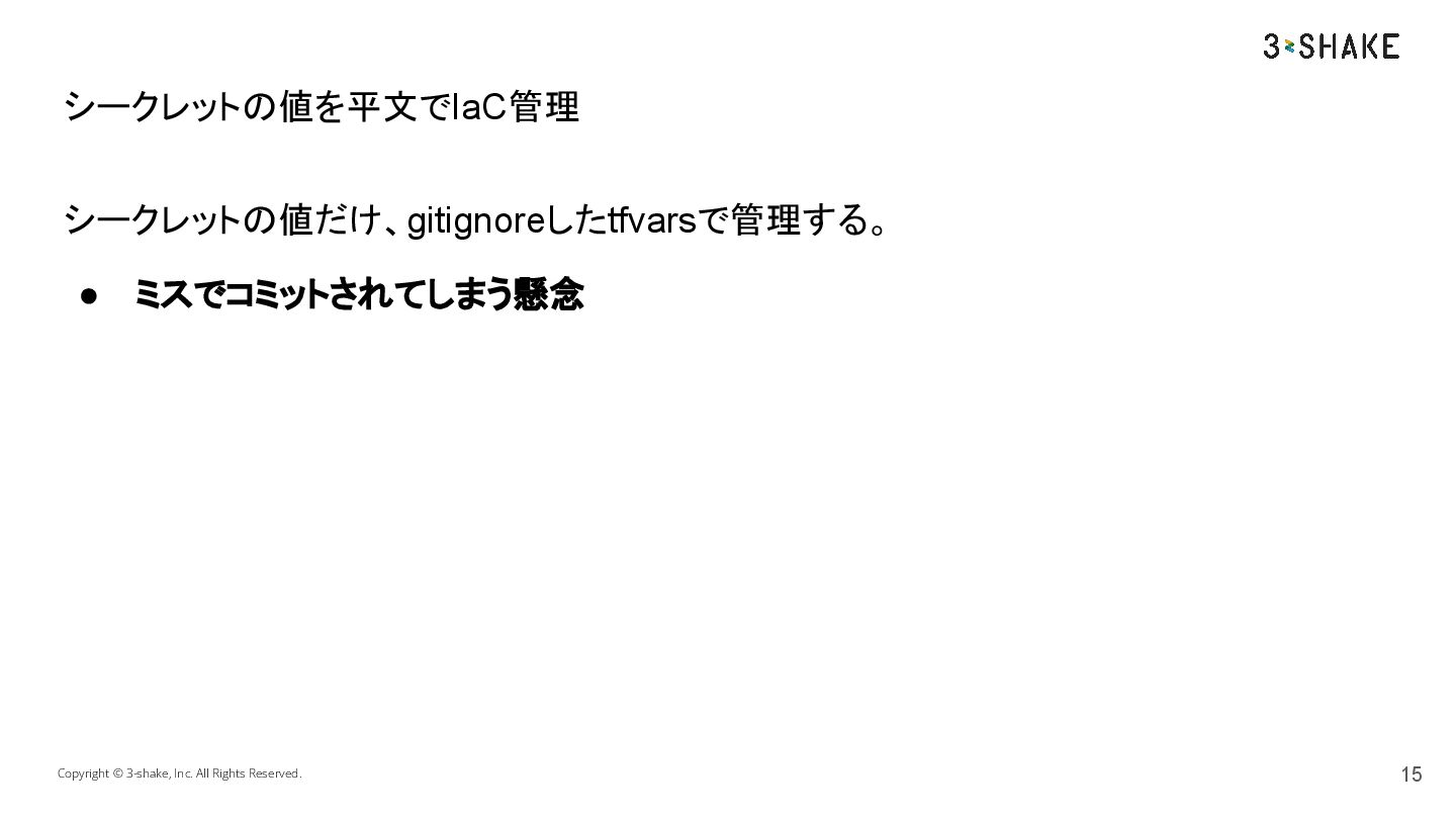 シークレットの値だけ、gitignoreしたtfvarsで管理する。 • ミスでコミットされてしまう懸念 Copyright © 3-shake, Inc. All Rights Reserved.
