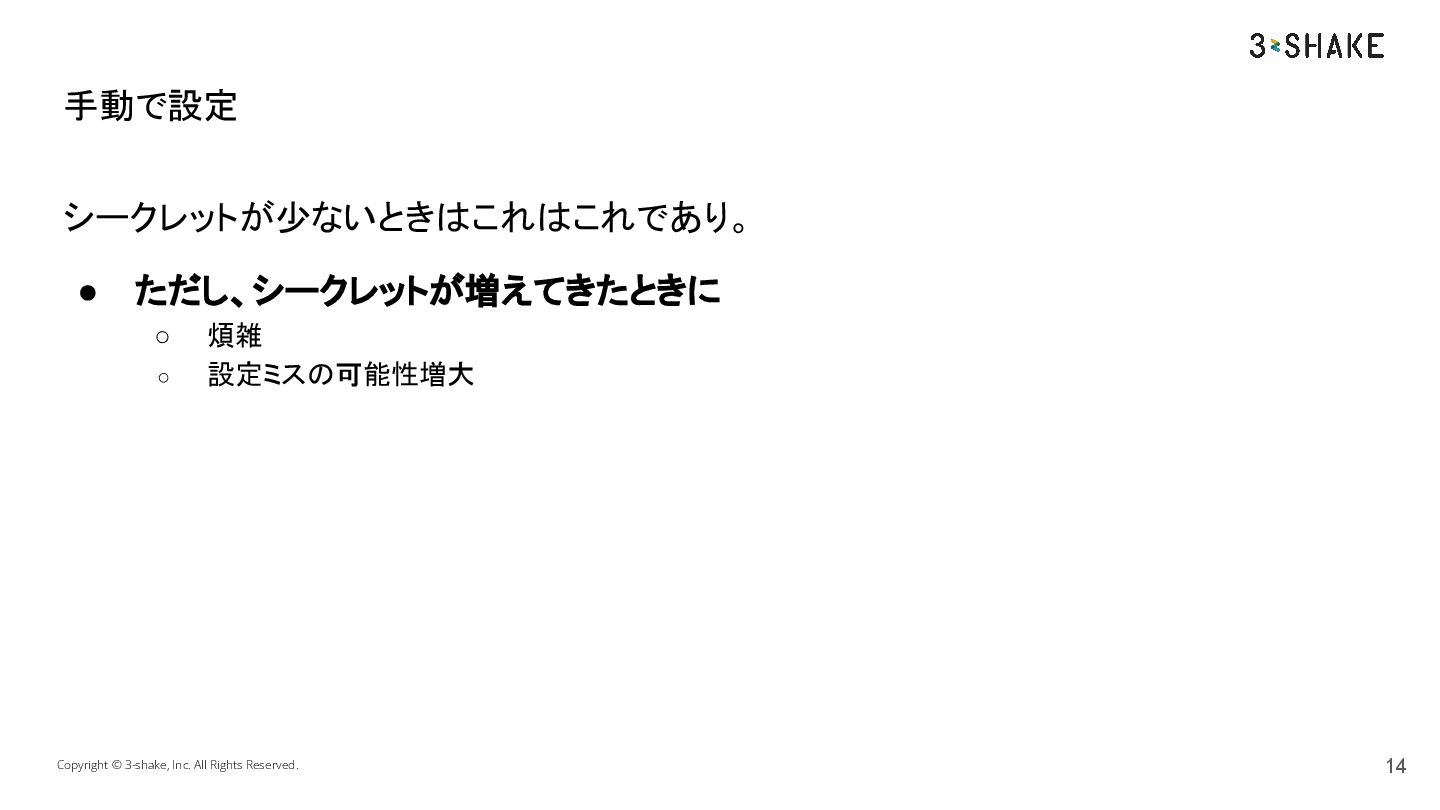シークレットが少ないときはこれはこれであり。 • ただし、シークレットが増えてきたときに ◦ 煩雑 ◦ 設定ミスの可能性増大 Copyright © 3-shake,