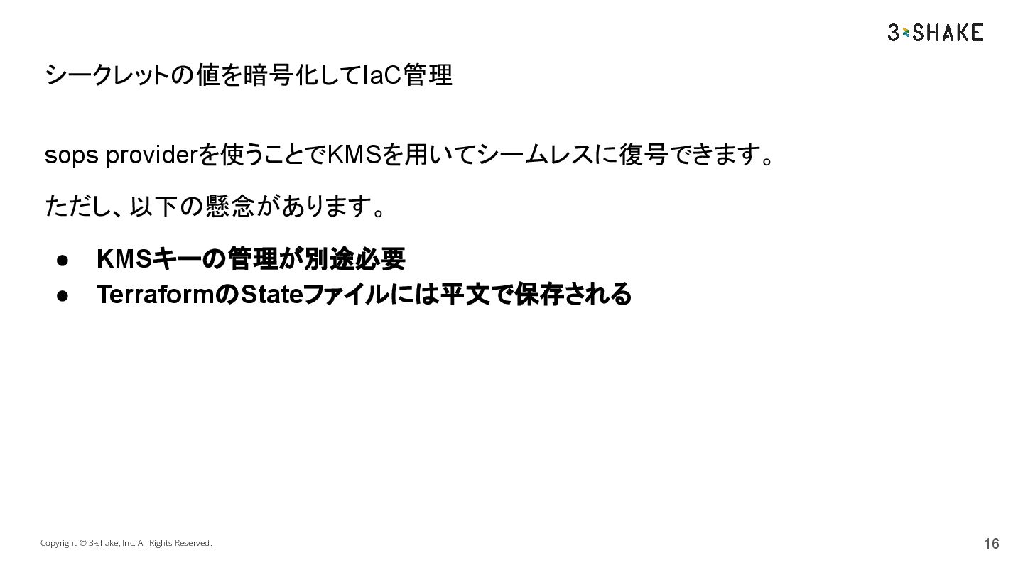 sops providerを使うことでKMSを用いてシームレスに復号できます。 ただし、以下の懸念があります。 • KMSキーの管理が別途必要 • TerraformのStateファイルには平文で保存される Copyright © 3-shake,