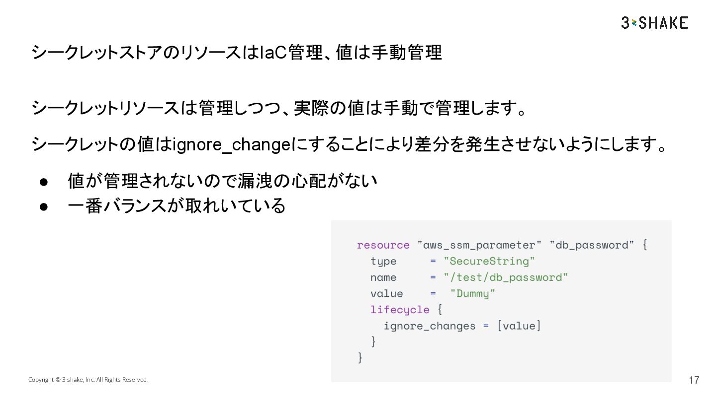 シークレットリソースは管理しつつ、実際の値は手動で管理します。 シークレットの値はignore_changeにすることにより差分を発生させないようにします。 • 値が管理されないので漏洩の心配がない • 一番バランスが取れいている Copyright © 3-shake, Inc.