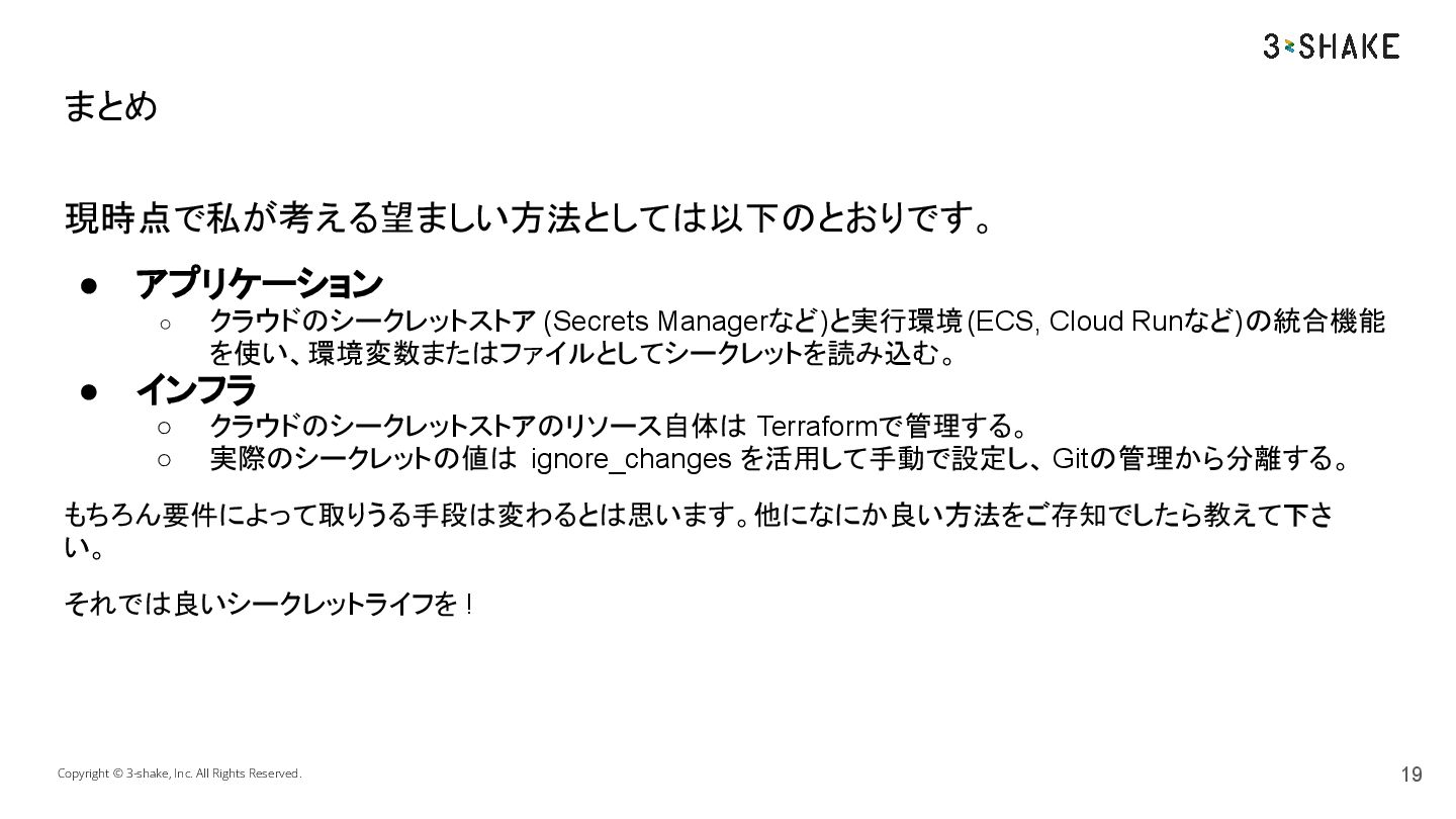 • インフラ ◦ クラウドのシークレットストアのリソース自体は Terraformで管理する。 ◦ 実際のシークレットの値は ignore_changes を活用して手動で設定し、 Gitの管理から分離する。 もちろん要件によって取りうる手段は変わるとは思います。他になにか良い方法をご存知でしたら教えて下さ い。 それでは良いシークレットライフを ! Copyright © 3-shake, Inc. All Rights Reserved. まとめ 19