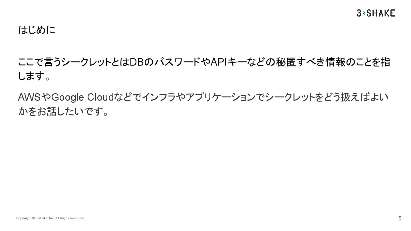 ここで言うシークレットとはDBのパスワードやAPIキーなどの秘匿すべき情報のことを指 します。 AWSやGoogle Cloudなどでインフラやアプリケーションでシークレットをどう扱えばよい かをお話したいです。 Copyright © 3-shake, Inc. All
