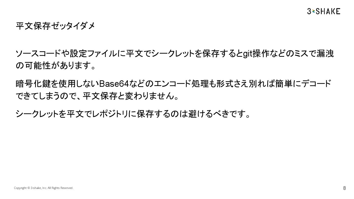 ソースコードや設定ファイルに平文でシークレットを保存するとgit操作などのミスで漏洩 の可能性があります。 暗号化鍵を使用しないBase64などのエンコード処理も形式さえ別れば簡単にデコード できてしまうので、平文保存と変わりません。 シークレットを平文でレポジトリに保存するのは避けるべきです。 Copyright © 3-shake, Inc. All