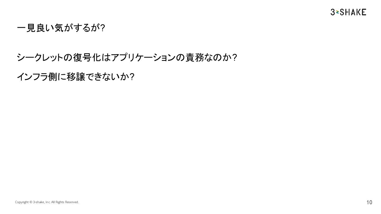 シークレットの復号化はアプリケーションの責務なのか? インフラ側に移譲できないか? Copyright © 3-shake, Inc. All Rights Reserved. 一見良い気がするが?