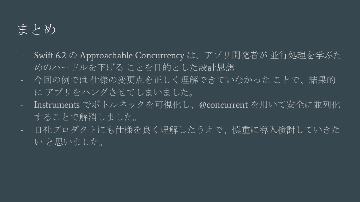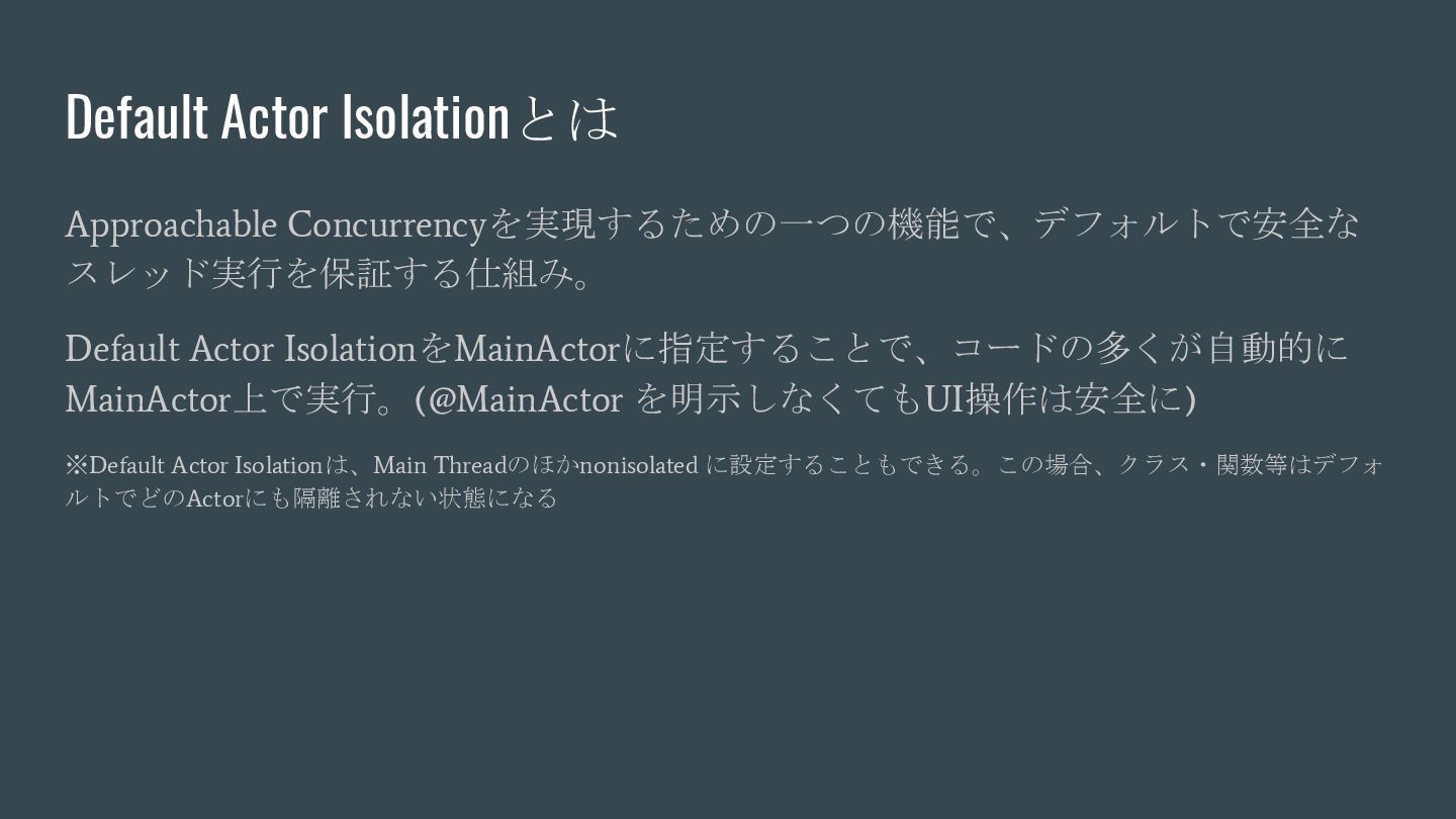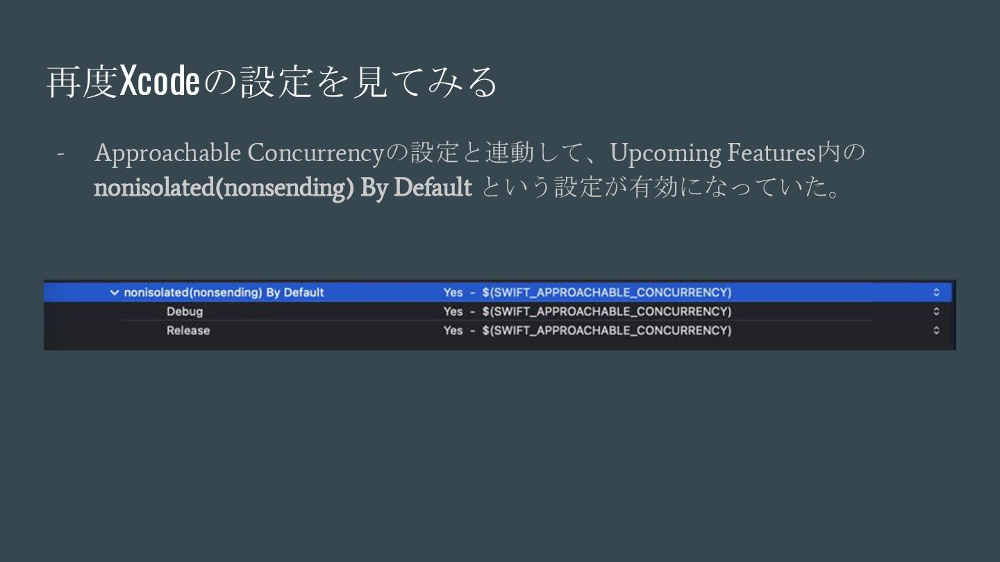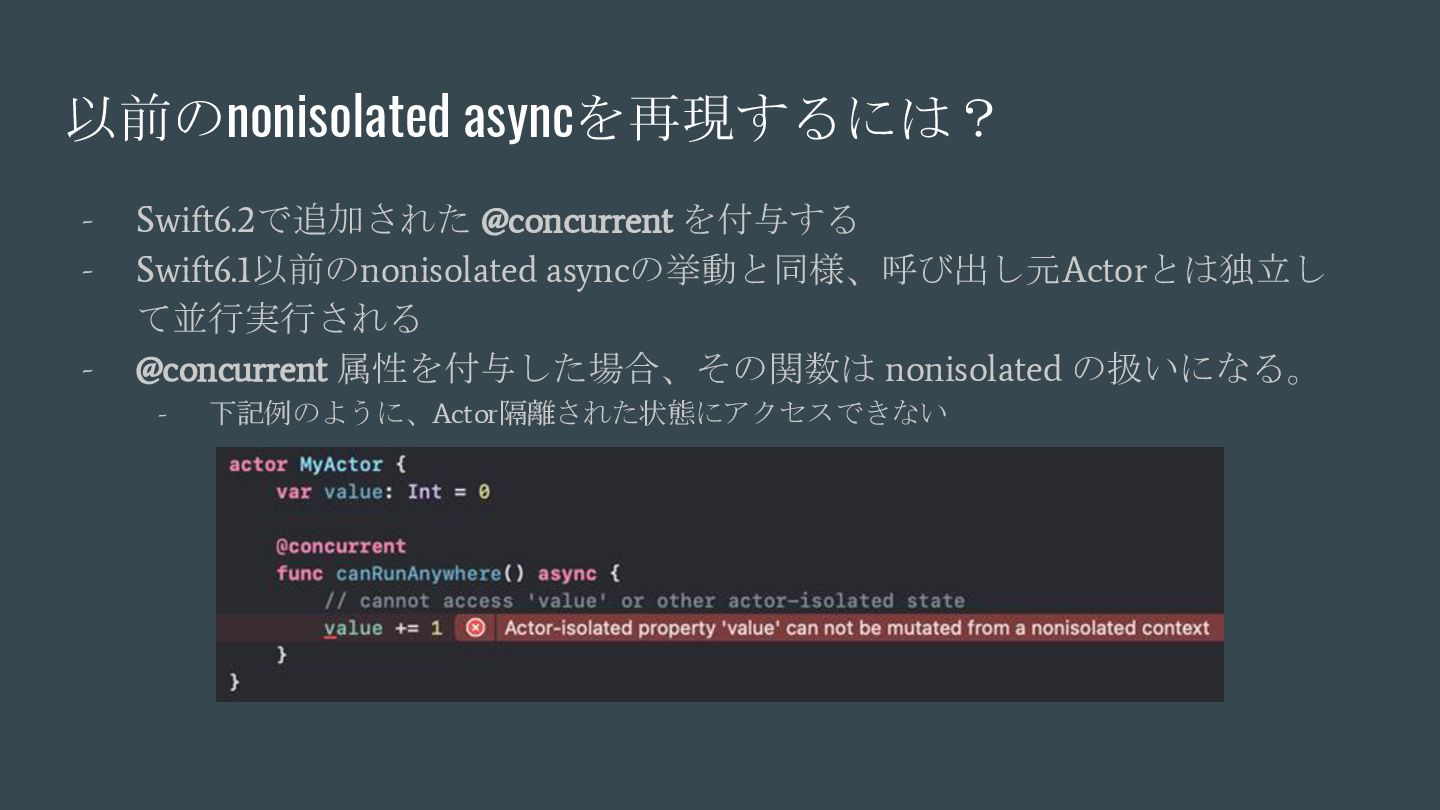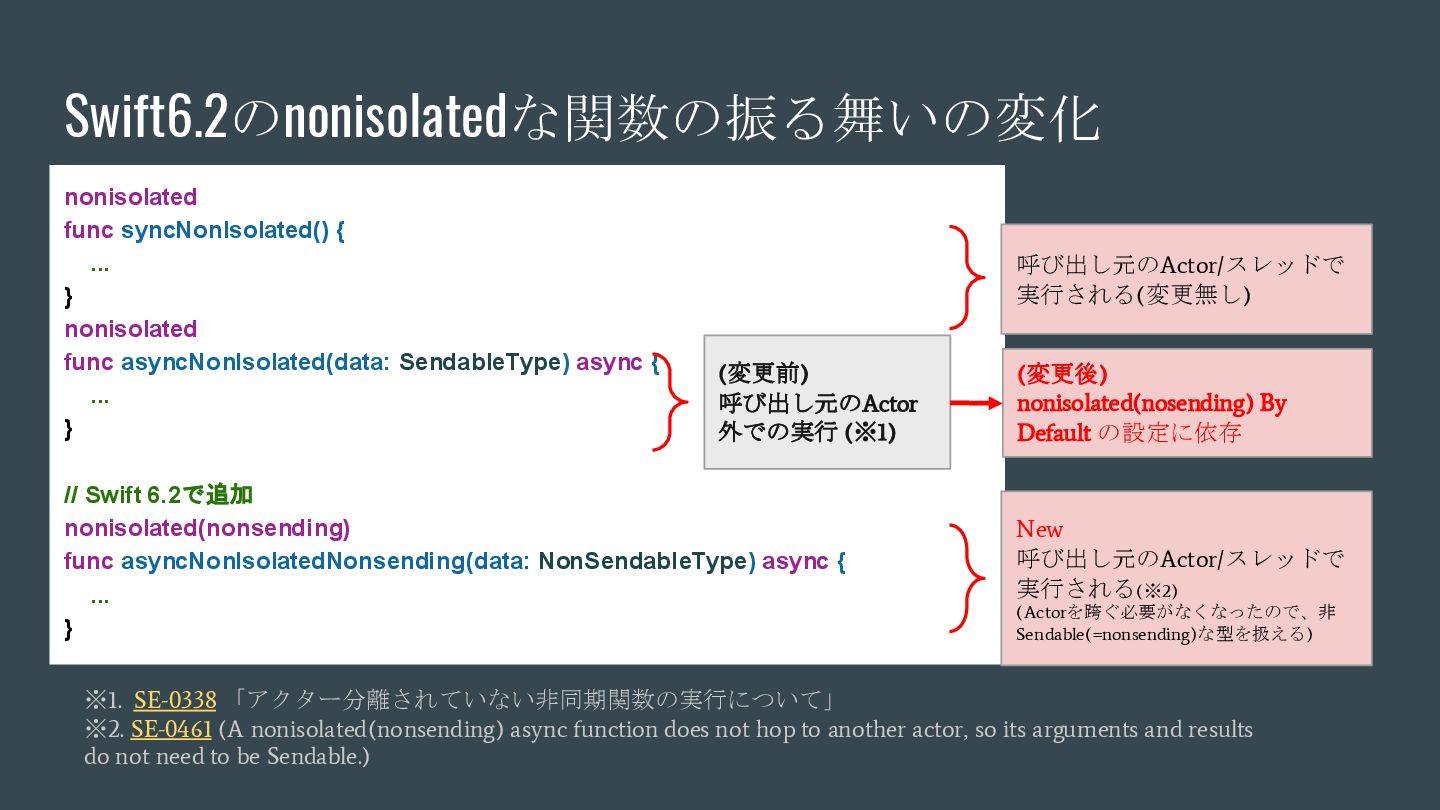 async { ... } // Swift 6.2で追加 nonisolated(nonsending) func asyncNonIsolatedNonsending(data: NonSendableType) async { ... } Swift6.2のnonisolatedな関数の振る舞いの変化 呼び出し元のActor/スレッドで 実行される(変更無し) New 呼び出し元のActor/スレッドで 実行される(※2) (Actorを跨ぐ必要がなくなったので、非 Sendable(=nonsending)な型を扱える) ※1. SE-0338 「アクター分離されていない非同期関数の実行について」 ※2. SE-0461 (A nonisolated(nonsending) async function does not hop to another actor, so its arguments and results do not need to be Sendable.) (変更後) nonisolated(nosending) By Default の設定に依存 (変更前) 呼び出し元のActor 外での実行 (※1)
