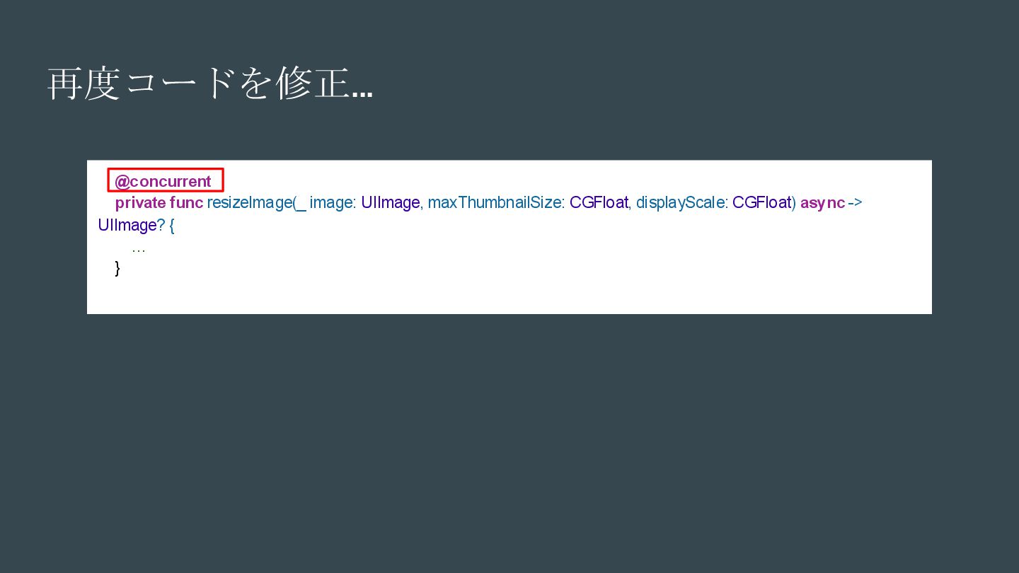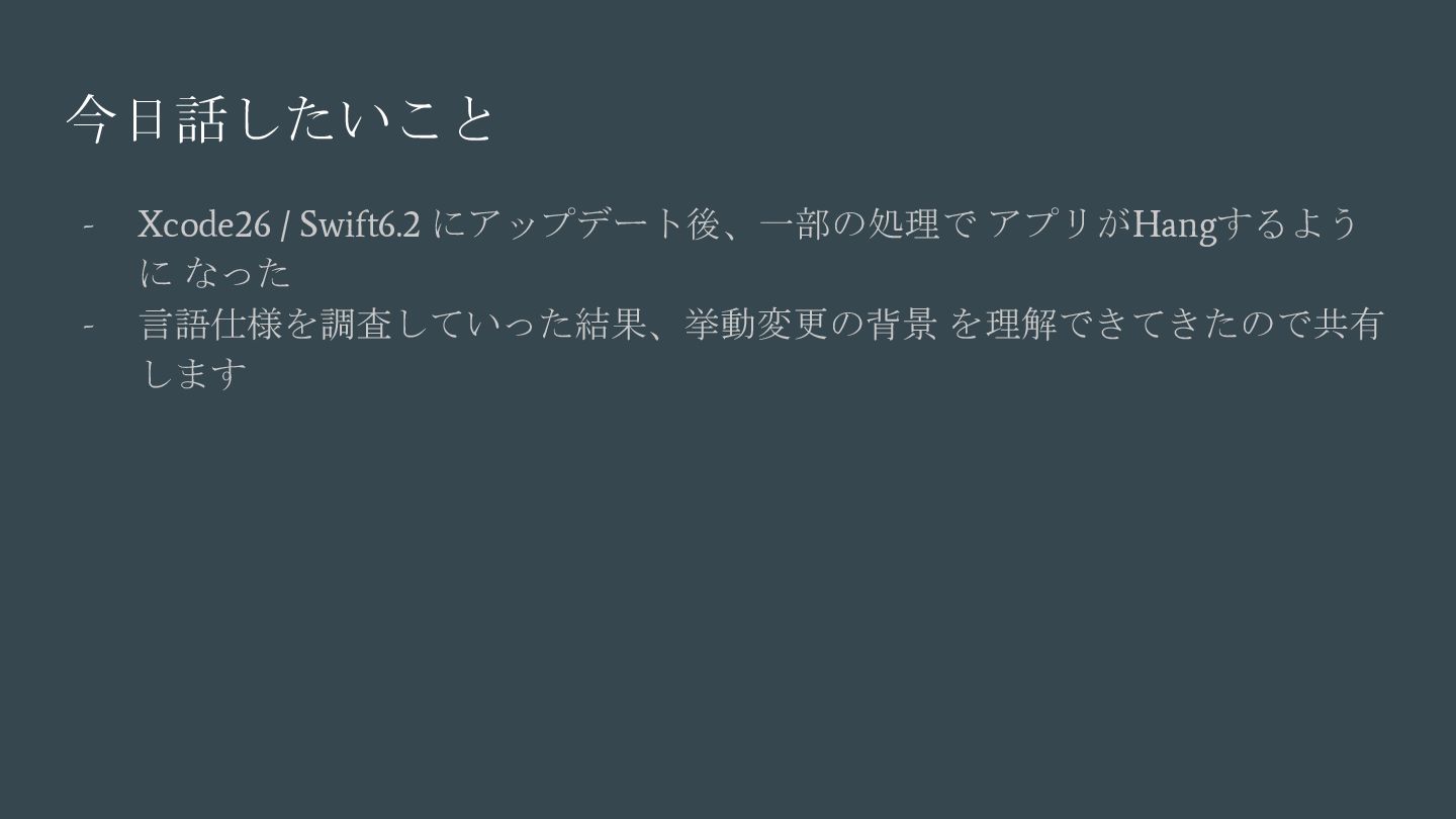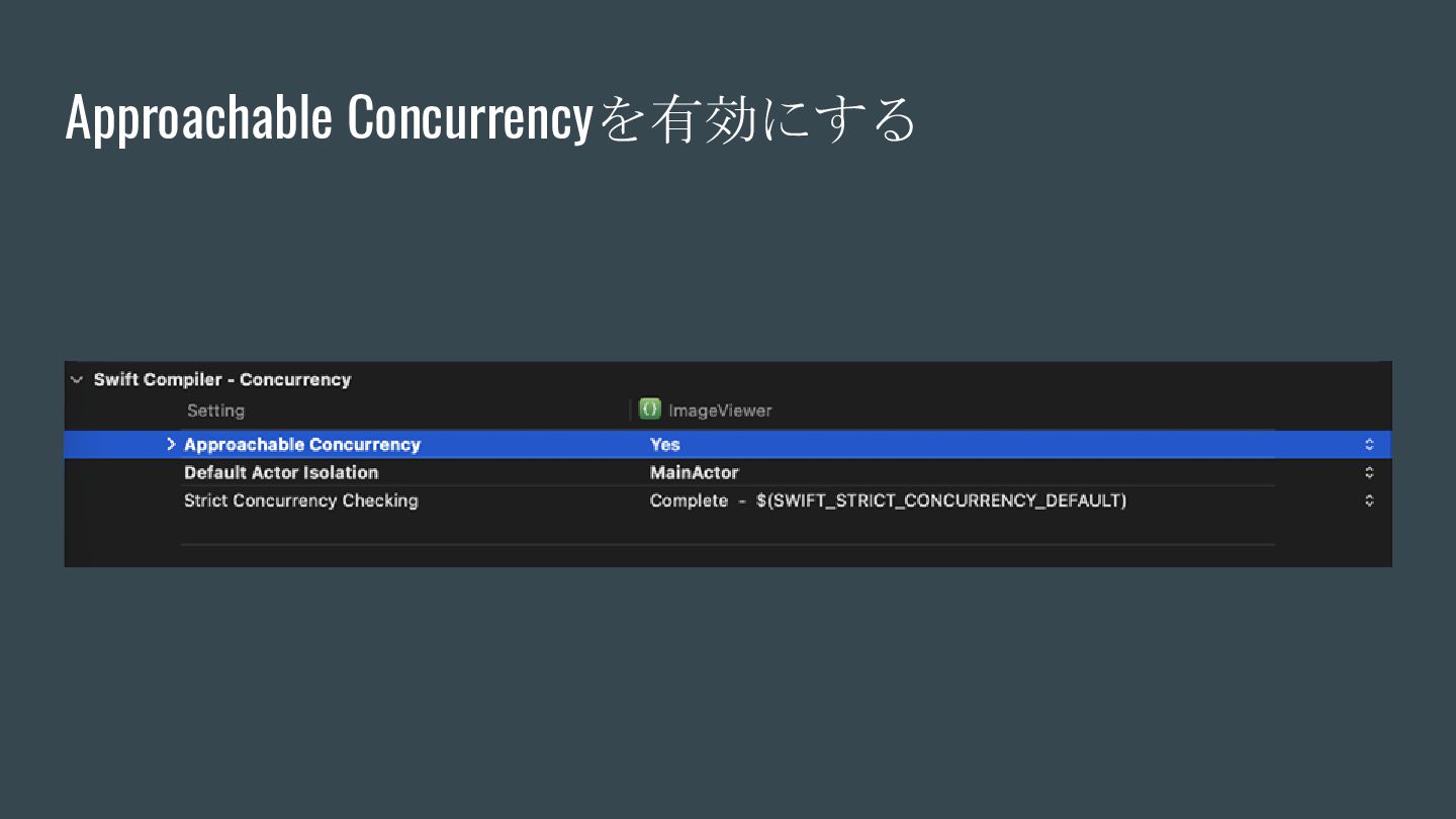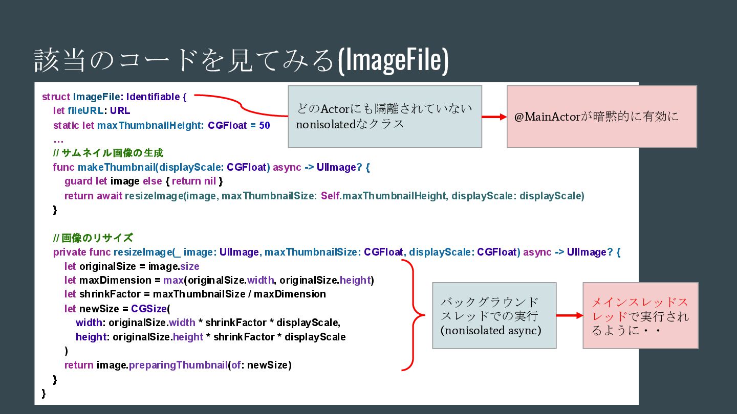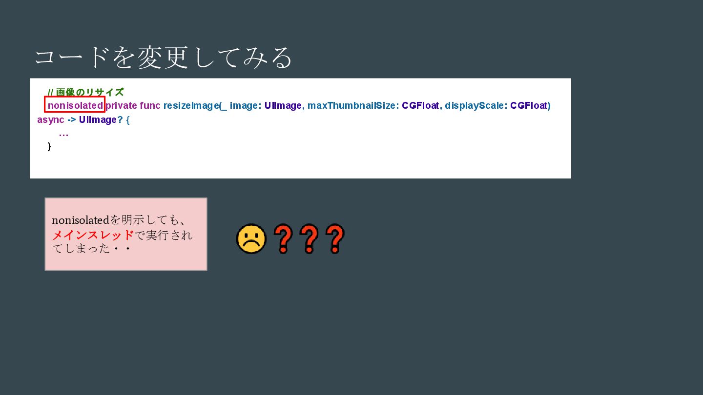 async { ... } // Swift 6.2で追加 nonisolated(nonsending) func asyncNonIsolatedNonsending(data: NonSendableType) async { ... } Swift6.2のnonisolatedな関数の振る舞いの変化 呼び出し元のActor/スレッドで 実行される(変更無し) New 呼び出し元のActor/スレッドで 実行される(※2) (Actorを跨ぐ必要がなくなったので、非 Sendable(=nonsending)な型を扱える) ※1. SE-0338 「アクター分離されていない非同期関数の実行について」 ※2. SE-0461 (A nonisolated(nonsending) async function does not hop to another actor, so its arguments and results do not need to be Sendable.) (変更後) nonisolated(nosending) By Default の設定に依存 (変更前) 呼び出し元のActor 外での実行 (※1)
