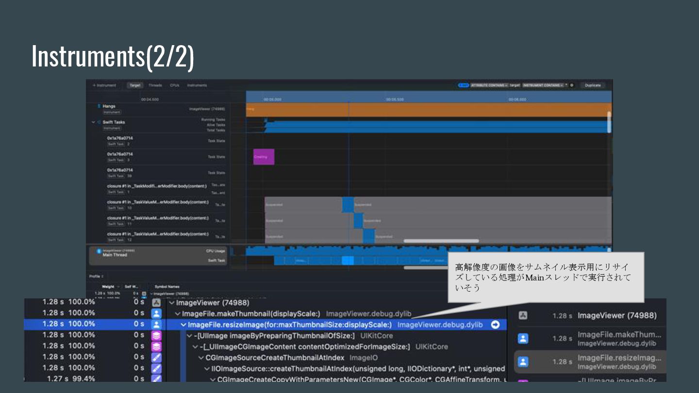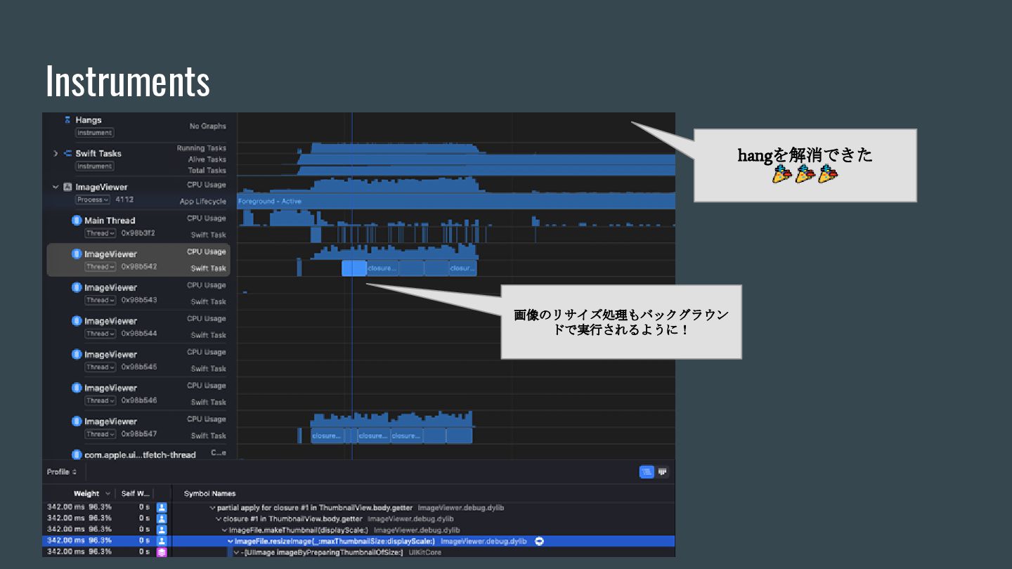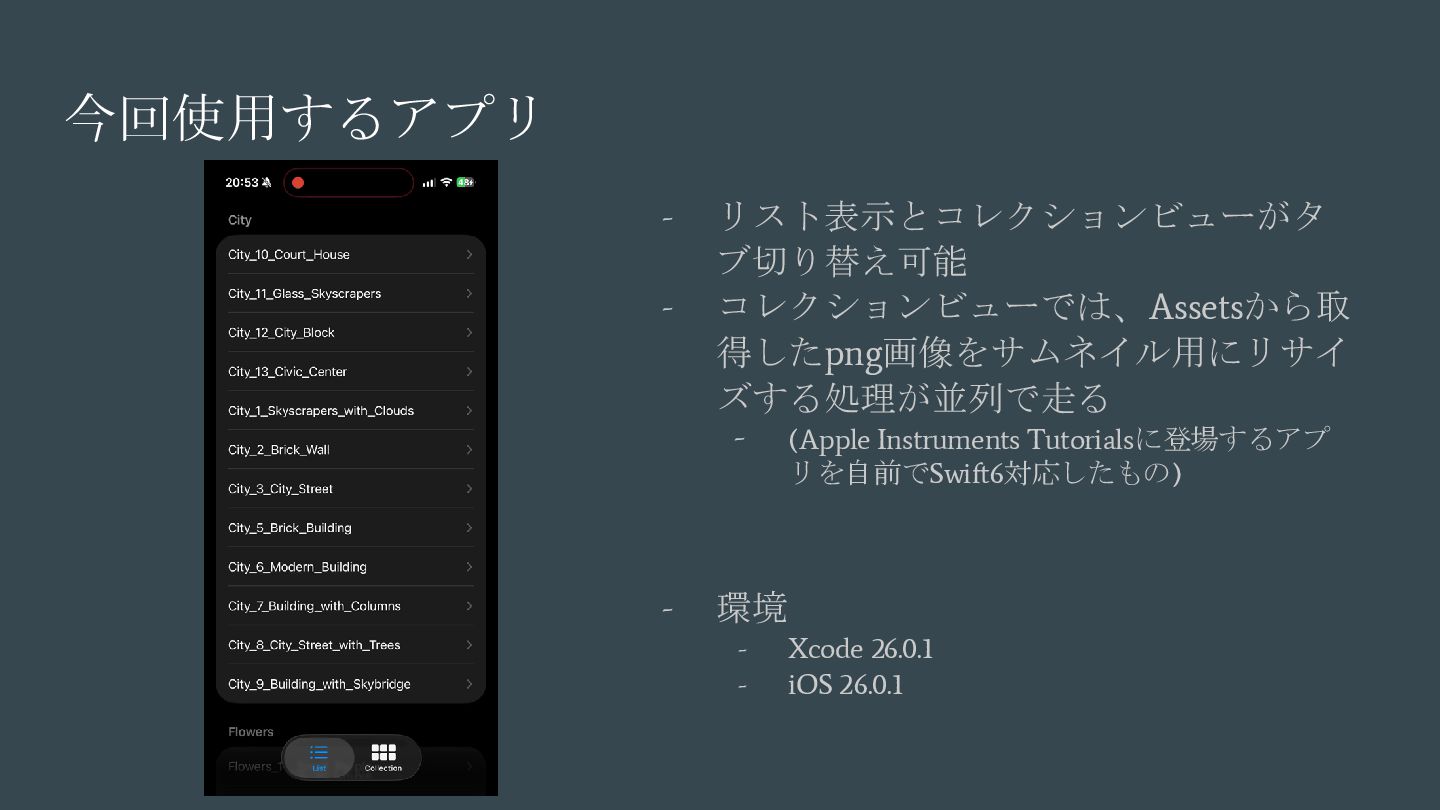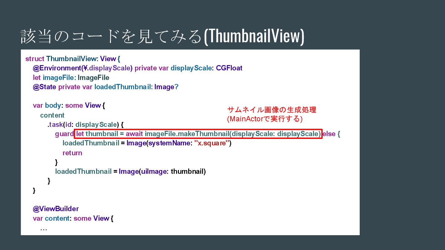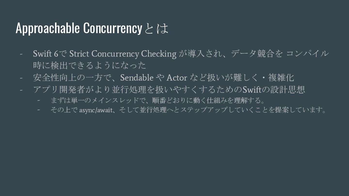 async { ... } // Swift 6.2で追加 nonisolated(nonsending) func asyncNonIsolatedNonsending(data: NonSendableType) async { ... } Swift6.2のnonisolatedな関数の振る舞いの変化 呼び出し元のActor/スレッドで 実行される(変更無し) New 呼び出し元のActor/スレッドで 実行される(※2) (Actorを跨ぐ必要がなくなったので、非 Sendable(=nonsending)な型を扱える) ※1. SE-0338 「アクター分離されていない非同期関数の実行について」 ※2. SE-0461 (A nonisolated(nonsending) async function does not hop to another actor, so its arguments and results do not need to be Sendable.) (変更後) nonisolated(nosending) By Default の設定に依存 (変更前) 呼び出し元のActor 外での実行 (※1)