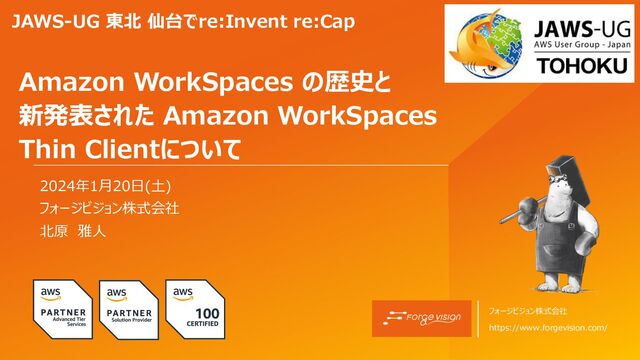 Core Λࡌͨ͠Ϋϥυ PC ΛϦϦʔε 2.2023/03/21 AWS Ͱ Windows 11 ϥΠηϯεΛ Amazon WorkSpaces ʹ࣋ͪࠐΊΔΑ͏ʹͳΔ 3.2023/04/06 Amazon WorkSpaces Core ͕ Microsoft Office 2019 Professional Plus όϯυϧΛൃද 4.2023/04/19 WSP ʹΑΔ Amazon WorkSpaces Web Access ͕ AWS GovCloud (ถࠃ෦) ϦʔδϣϯͰ ར༻Մೳʹ 5.2023/05/03 AWS ͕ AWS GovCloud (ถࠃ) ϦʔδϣϯͰͷ Amazon WorkSpaces Core ϦϦʔεΛൃද 6.2023/05/11 AWS Service Management Connector ͕ Terraform ʹΑΔϓϩϏδϣχϯάΛαϙʔτ͢ ΔΑ͏ʹͳΓ·ͨ͠ 7.2023/05/30 Amazon WorkSpaces Ͱͷ NICE DCV ֦ு SDK ͷαϙʔτΛ։࢝ 8.2023/08/01 Microsoft 365 Apps for enterprise ͕ Amazon WorkSpaces αʔϏεͰར༻Մೳʹ 9.2023/08/24 Amazon WorkSpaces ʹ͓͍ͯ Ubuntu 20.04 ͱ 22.04 Λαϙʔτ͢ΔόʔδϣϯΛඋ͑ͨ ৽͍͠ Linux ΫϥΠΞϯτΛൃද 2024/1/20 #jawsug #jawsugtohoku 22