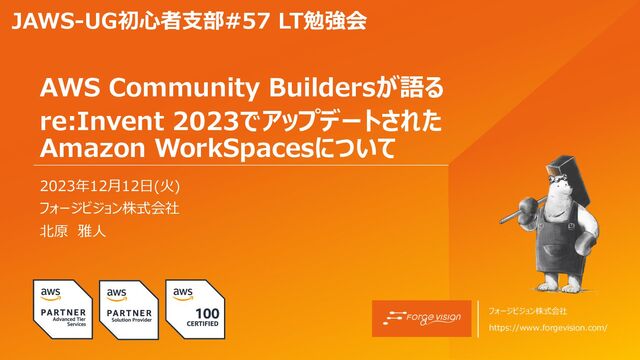 フォージビジョン株式会社 https://www.forgevision.com/ AWS Community Buildersが語る re:Invent 2023でアップデートされた Amazon WorkSpacesについて JAWS-UG初⼼者⽀部#57