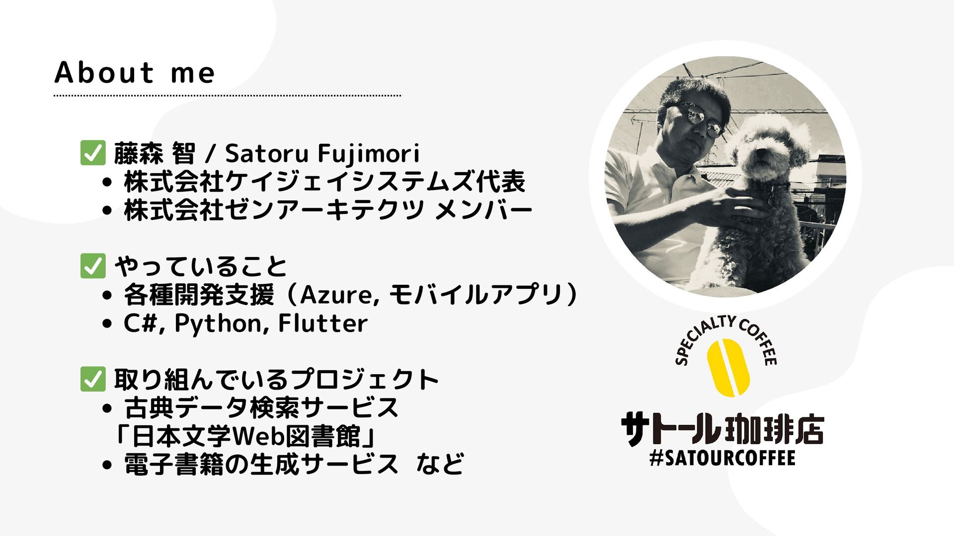 やっていること 各種開発支援(Azure, モバイルアプリ) C#, Python, Flutter ✅ 取り組んでいるプロジェクト 古典データ検索サービス 「日本文学Web図書館」 電子書籍の生成サービス など About me