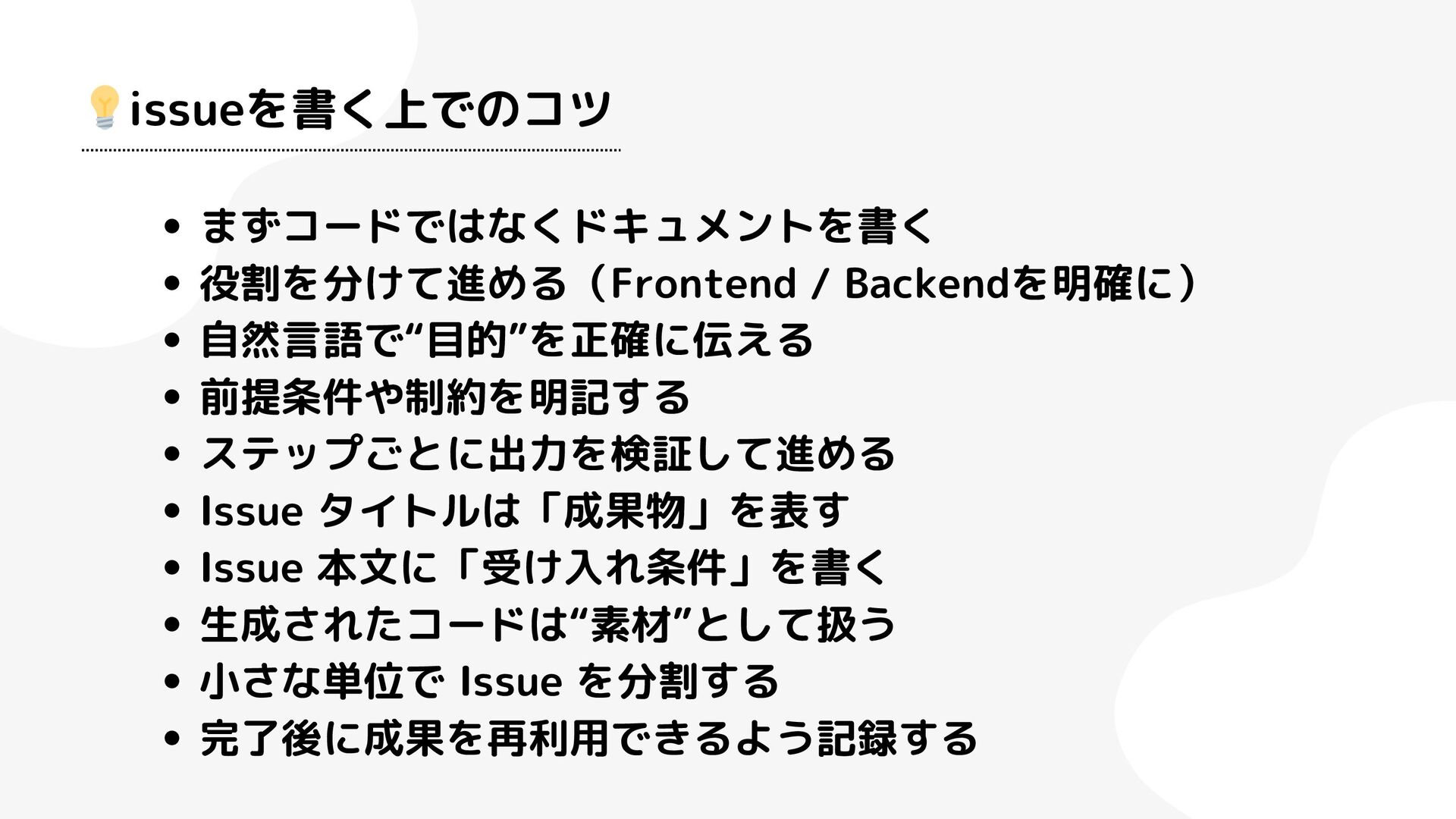 Issue 本文に「受け入れ条件」を書く 生成されたコードは“素材”として扱う 小さな単位で Issue を分割する 完了後に成果を再利用できるよう記録する