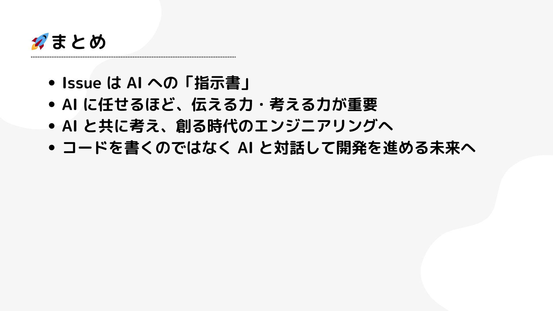 Issue は AI への「指示書」 AI に任せるほど、伝える力・考える力が重要 AI と共に考え、創る時代のエンジニアリングへ コードを書くのではなく AI