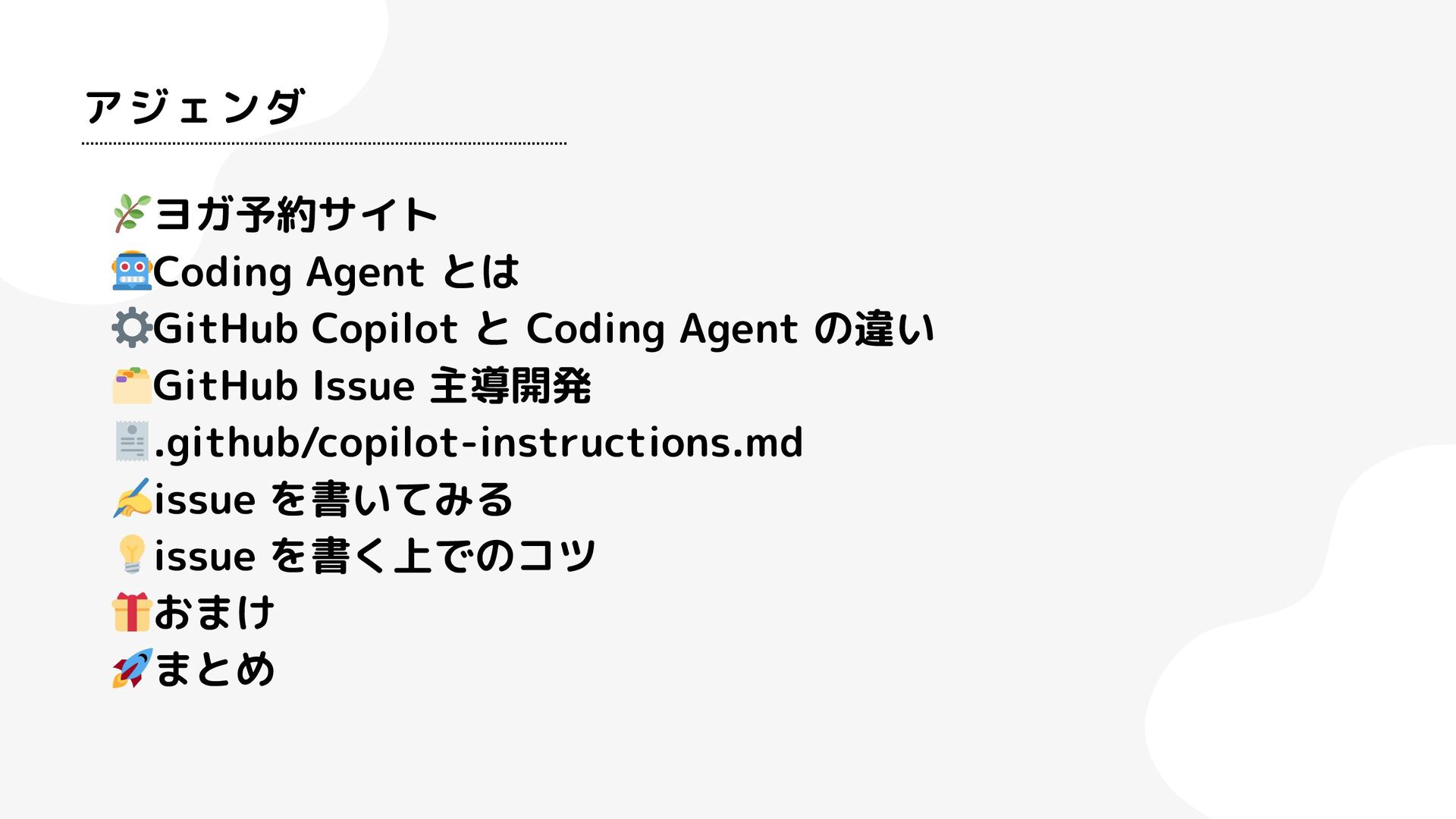 アジェンダ 🌿ヨガ予約サイト 🤖Coding Agent とは ⚙️GitHub Copilot と Coding Agent