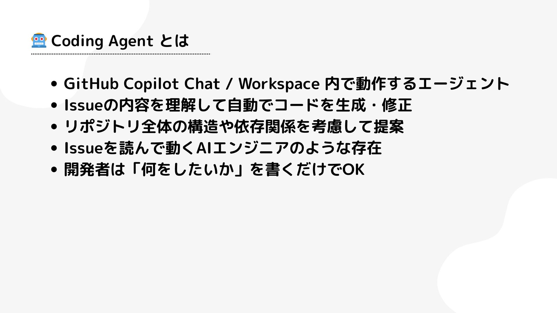 🤖 Coding Agent とは GitHub Copilot Chat / Workspace 内で動作するエージェント