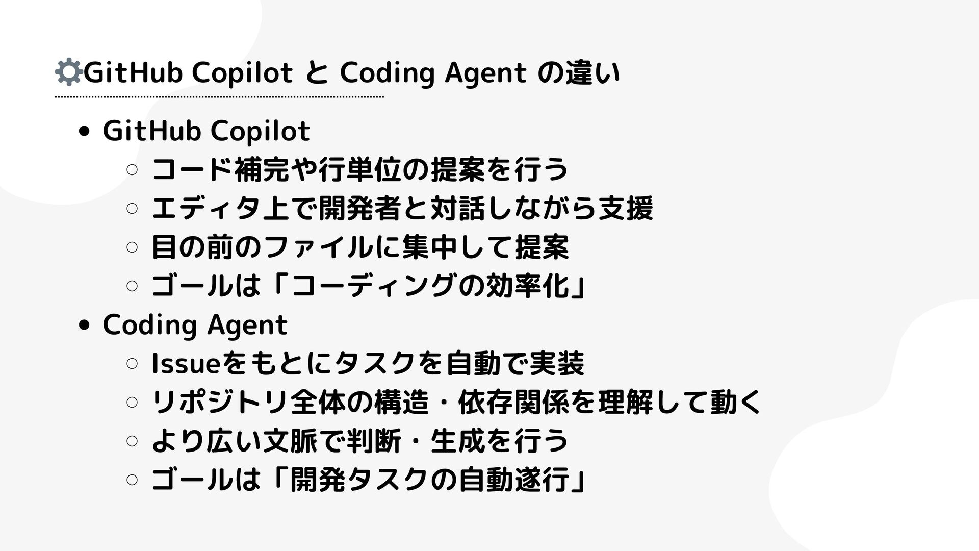 目の前のファイルに集中して提案 ゴールは「コーディングの効率化」 Coding Agent Issueをもとにタスクを自動で実装 リポジトリ全体の構造・依存関係を理解して動く より広い文脈で判断・生成を行う ゴールは「開発タスクの自動遂行」