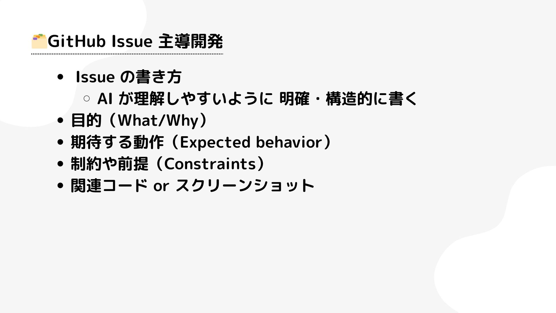 🗂️GitHub Issue 主導開発 Issue の書き方 AI が理解しやすいように 明確・構造的に書く 目的(What/Why) 期待する動作(Expected