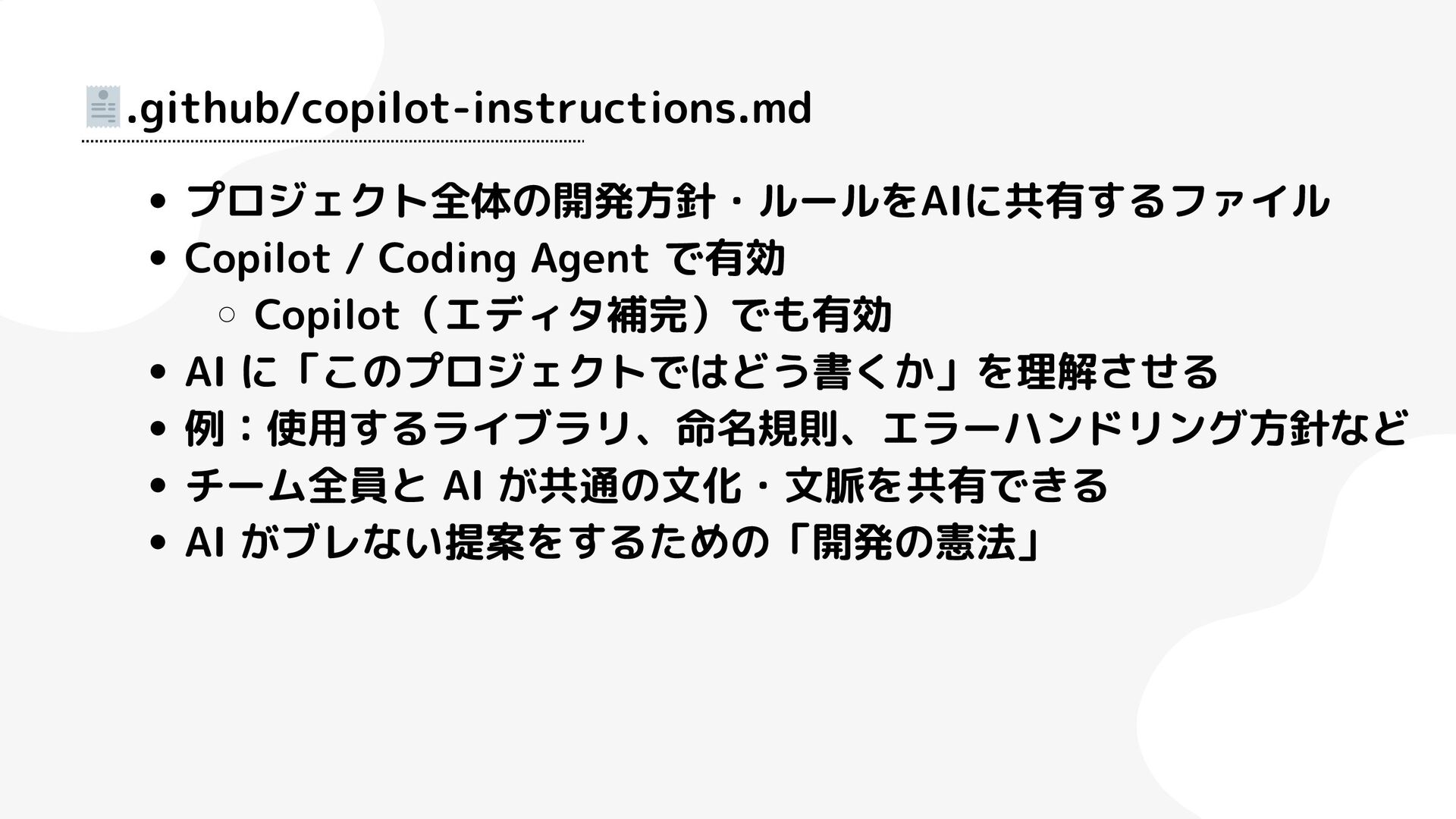 🧾.github/copilot-instructions.md プロジェクト全体の開発方針・ルールをAIに共有するファイル Copilot / Coding Agent で有効 Copilot(エディタ補完)でも有効 AI に「このプロジェクトではどう書くか」を理解させる
