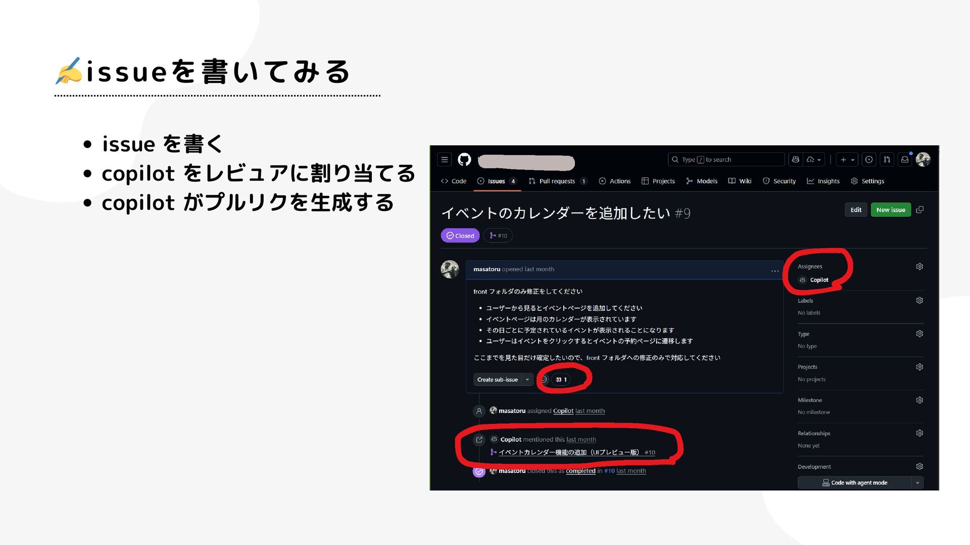 ✍️issueを書いてみる issue を書く copilot をレビュアに割り当てる copilot がプルリクを生成する