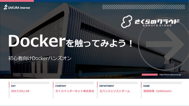 エバンジェリストチーム 横田真俊(@Wslash) さくらインターネット株式会社 初心者向けDockerハンズオン Dockerを触ってみよう! 2017/01/18