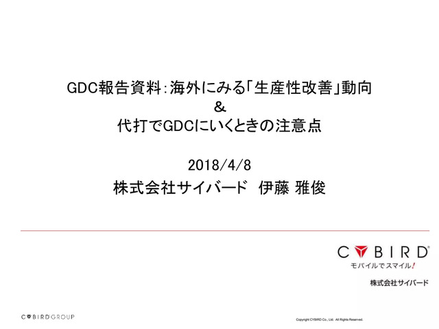 GDC2018セッションから、生産性改善にまつわるセッションをご紹介します。また、急遽渡米することになった際に起きるさまざまな問題についての知見も共有いたします。