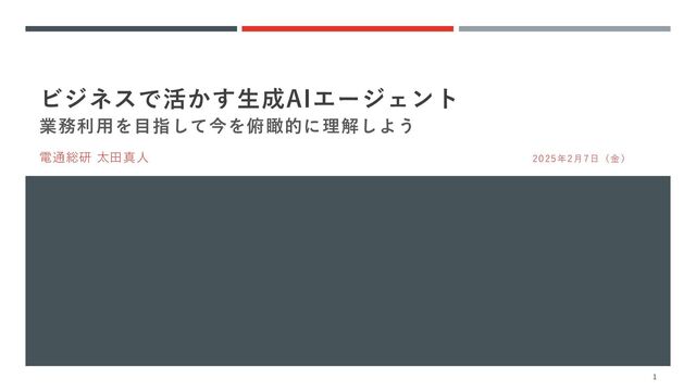 ビジネスで活かす生成AIエージェント 業務利用を目指して今を俯瞰的に理解しよう 電通総研 太田真人 2025年2月7日(金) 1