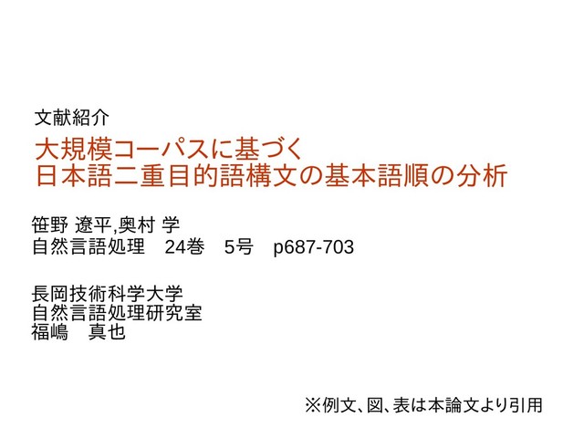 大規模コーパスに基づく 日本語二重目的語構文の基本語順の分析 笹野 遼平,奥村 学 自然言語処理 24巻 5号 p687-703 長岡技術科学大学 自然言語処理研究室 福嶋 真也 文献紹介