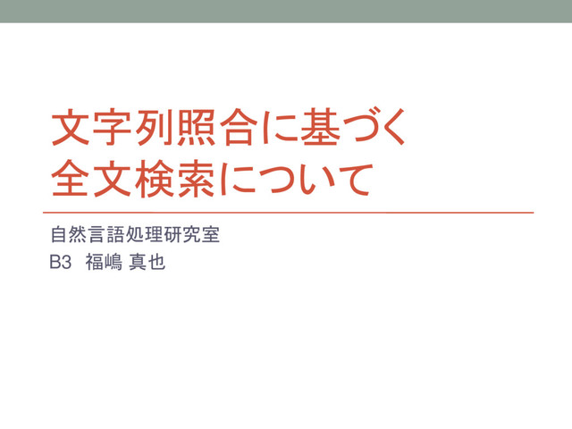 文字列照合に基づく 全文検索について 自然言語処理研究室 B3 福嶋 真也