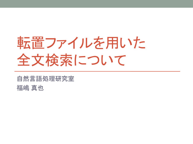3, 4, 5 0 0 1 1 1 2 file 2 0 1 0 0 0 3 full 1 1 0 0 0 0 4 index 2, 4 0 1 0 1 0 5 information 5 0 0 0 0 1 6 inverted 2 0 1 0 0 0 7 retrieval 5 0 0 0 0 1 8 search 1, 3, 4 1 0 1 1 0 9 sequential 3 0 0 1 0 0 10 text 1 1 0 0 0 0 1=full text search 2=inverted index file 3=sequential search algorithm 4=index search algorithm 5=information retrieval algorithm ※文書の位置は先頭を0とし、 空白も1文字とカウントする