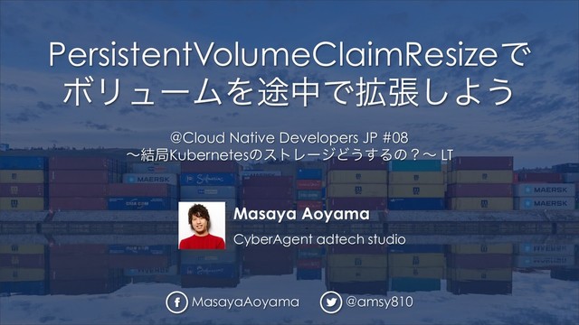 PersistentVolumeClaimResizeでボリュームを途中で拡張しよう @Cloud Native Developers JP #08〜結局Kubernetesのストレージどうするの?〜 LT Masaya Aoyama (@amsy810)