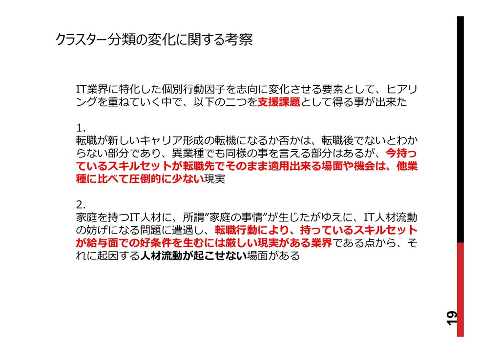 19 クラスター分類の変化に関する考察 IT業界に特化した個別行動因子を志向に変化させる要素として、ヒアリ ングを重ねていく中で、以下の二つを支援課題として得る事が出来た 1. 転職が新しいキャリア形成の転機になるか否かは、転職後でないとわか らない部分であり、異業種でも同様の事を言える部分はあるが、今持っ ているスキルセットが転職先でそのまま適用出来る場面や機会は、他業 種に比べて圧倒的に少ない現実 2.