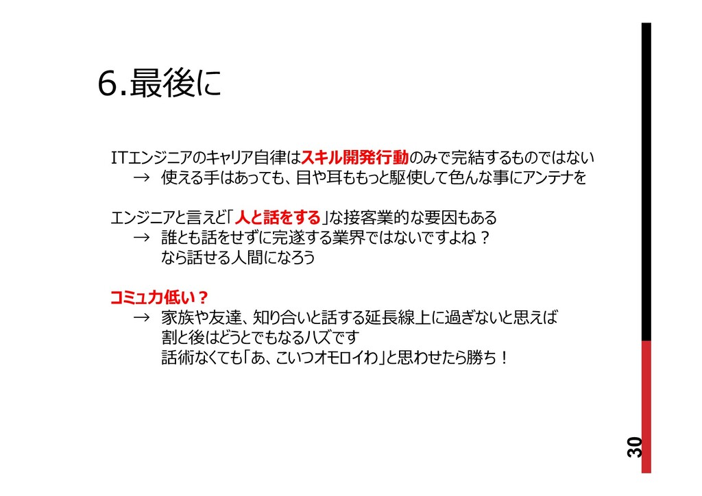 ITエンジニアのキャリア自律はスキル開発行動のみで完結するものではない → 使える手はあっても、目や耳ももっと駆使して色んな事にアンテナを エンジニアと言えど「人と話をする」な接客業的な要因もある → 誰とも話をせずに完遂する業界ではないですよね? なら話せる人間になろう コミュ力低い? → 家族や友達、知り合いと話する延⾧線上に過ぎないと思えば