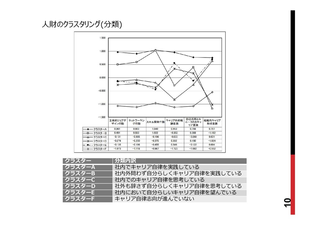 10 クラスター 分類内訳 クラスターA 社内でキャリア自律を実践している クラスターB 社内外問わず自分らしくキャリア自律を実践している クラスターC 社内でのキャリア自律を思考している クラスターD