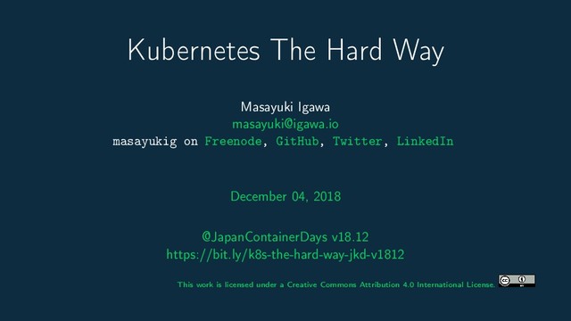GitHub, Twitter, LinkedIn December 04, 2018 @JapanContainerDays v18.12 https://bit.ly/k8s-the-hard-way-jkd-v1812 This work is licensed under a Creative Commons Attribution 4.0 International License.