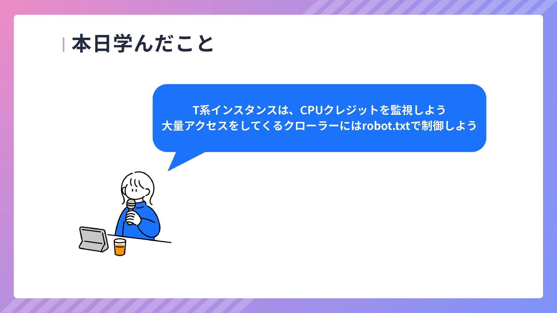 本日学んだこと T系インスタンスは、CPUクレジットを監視しよう 大量アクセスをしてくるクローラーにはrobot.txtで制御しよう