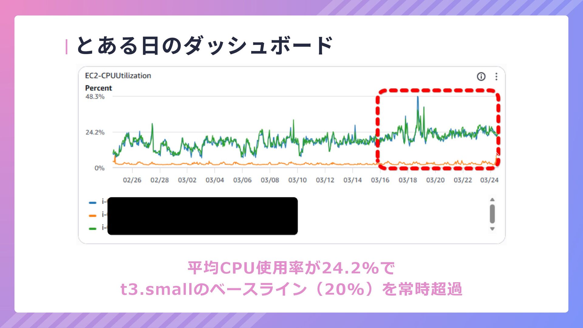 とある日のダッシュボード 平均CPU使用率が24.2%で t3.smallのベースライン(20%)を常時超過