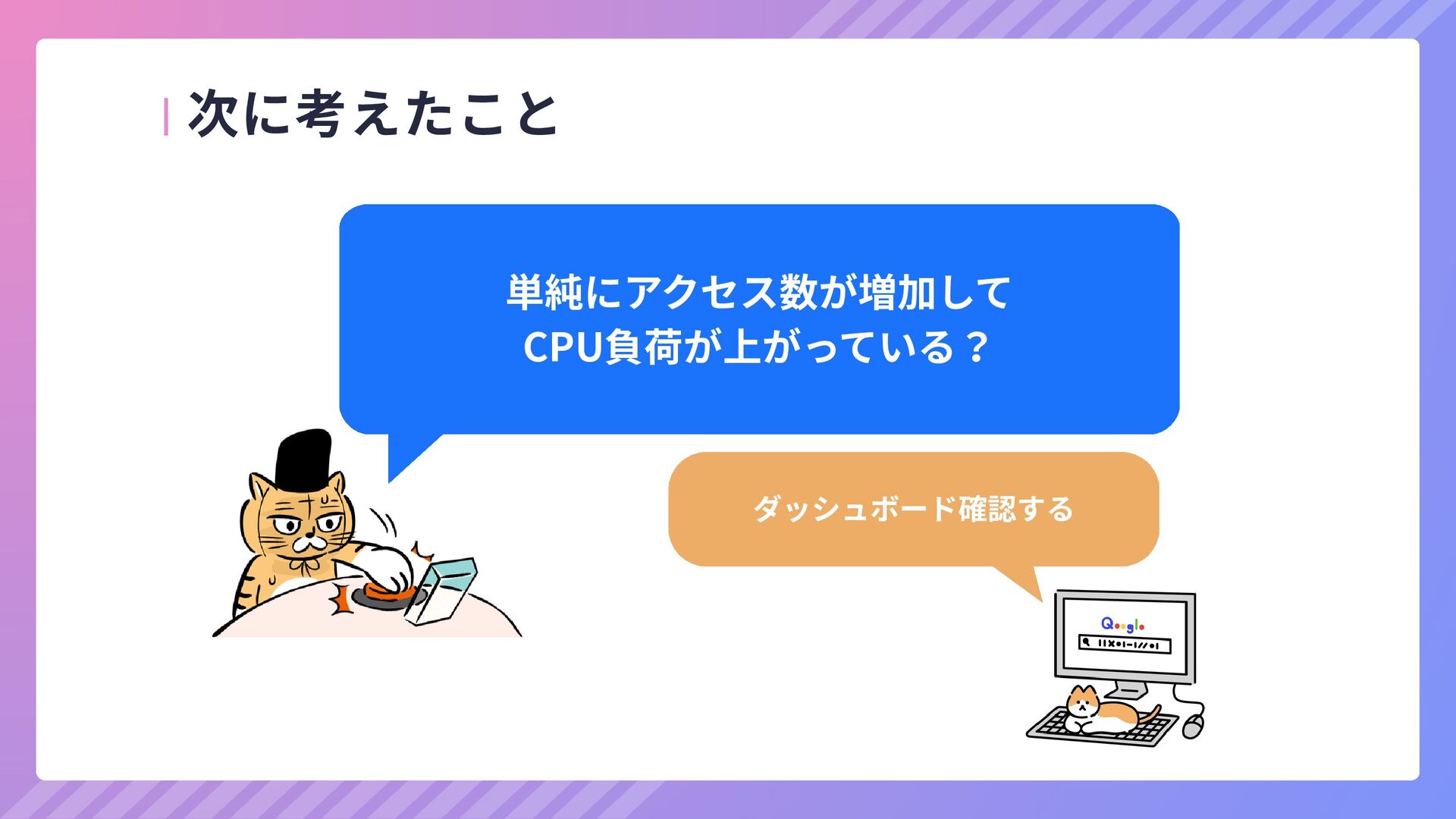 単純にアクセス数が増加して CPU負荷が上がっている? 次に考えたこと ダッシュボード確認する