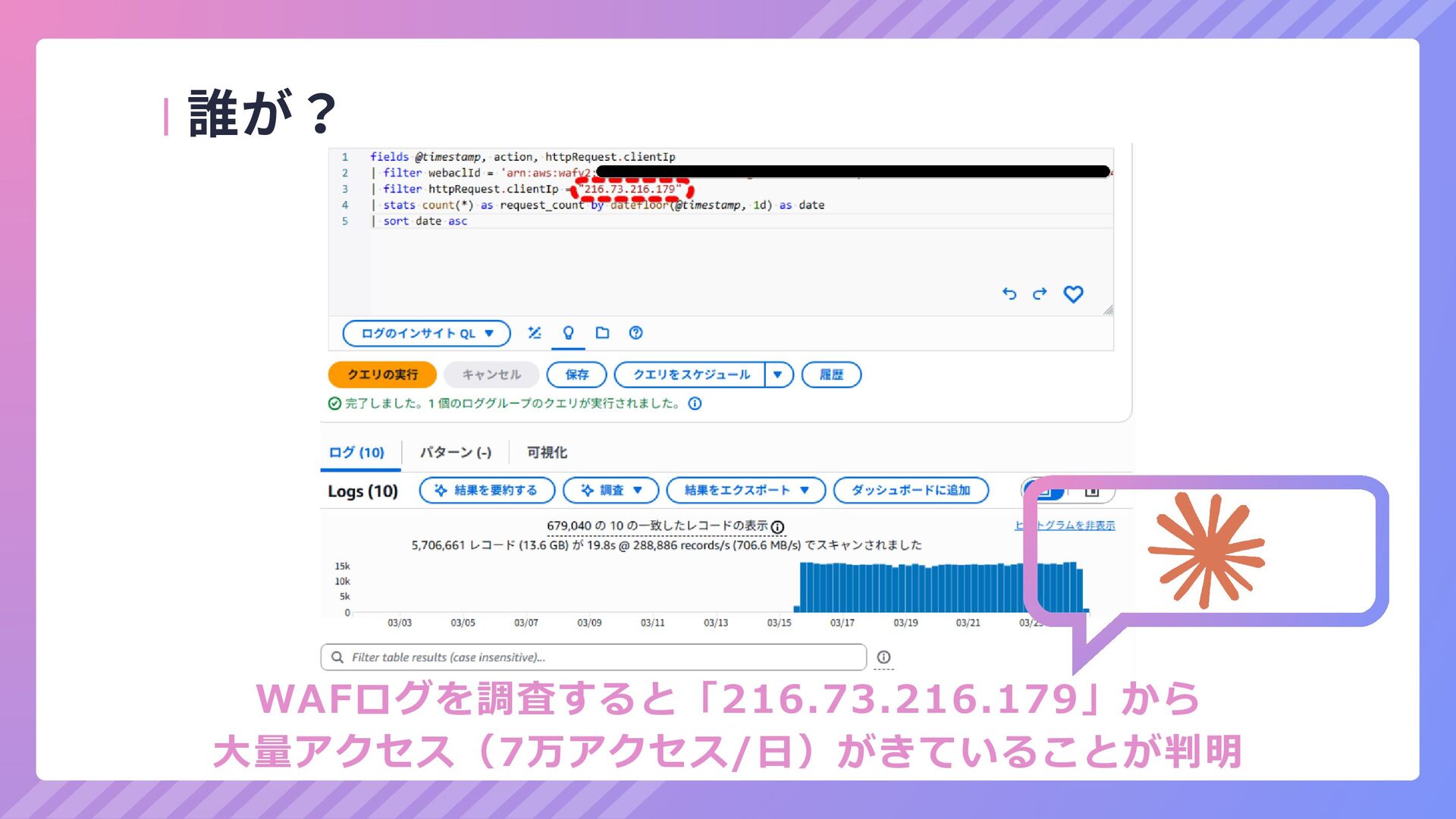 誰が? WAFログを調査すると「216.73.216.179」から 大量アクセス(7万アクセス/日)がきていることが判明