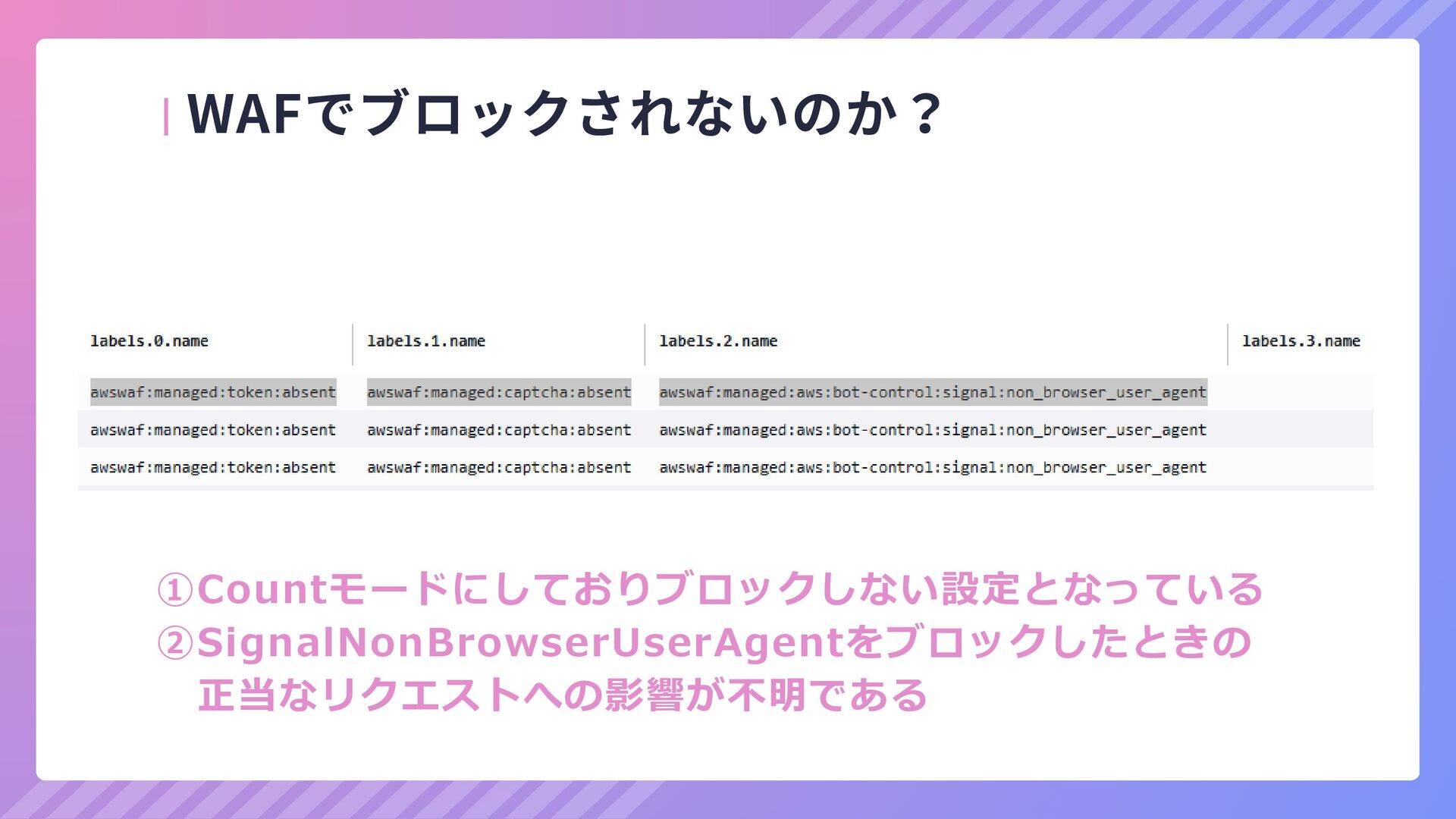 WAFでブロックされないのか? ①Countモードにしておりブロックしない設定となっている ②SignalNonBrowserUserAgentをブロックしたときの 正当なリクエストへの影響が不明である