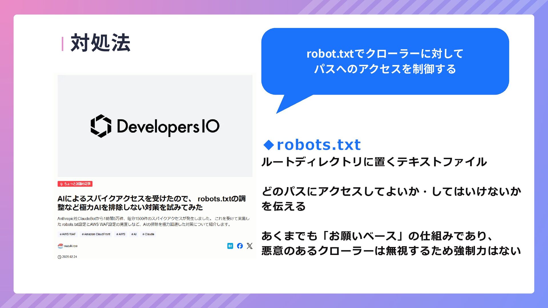 対処法 robot.txtでクローラーに対して パスへのアクセスを制御する ◆robots.txt ルートディレクトリに置くテキストファイル どのパスにアクセスしてよいか・してはいけないか を伝える あくまでも「お願いベース」の仕組みであり、 悪意のあるクローラーは無視するため強制力はない