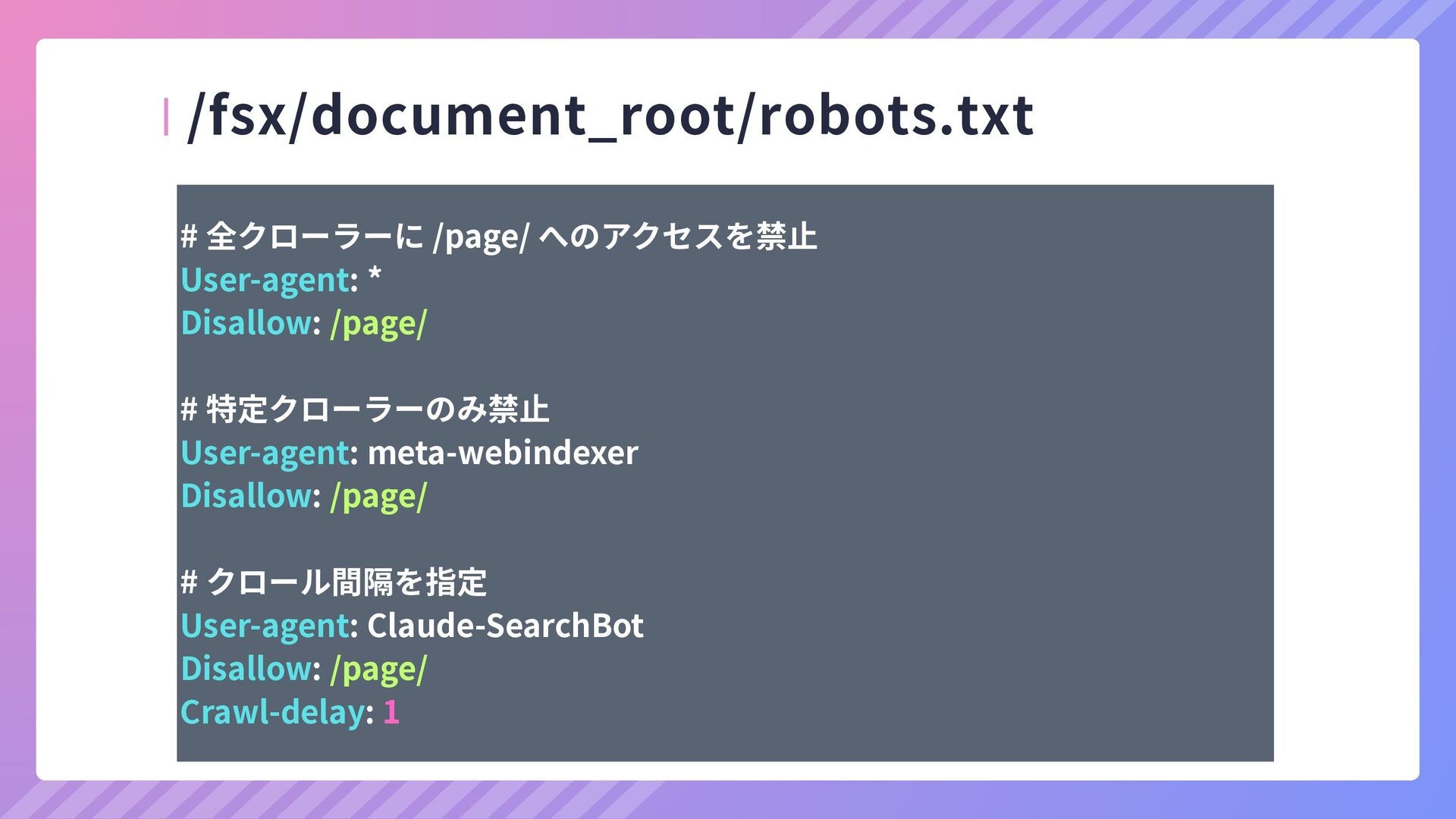 User-agent: meta-webindexer Disallow: /page/ # クロール間隔を指定 User-agent: Claude-SearchBot Disallow: /page/ Crawl-delay: 1 /fsx/document_root/robots.txt