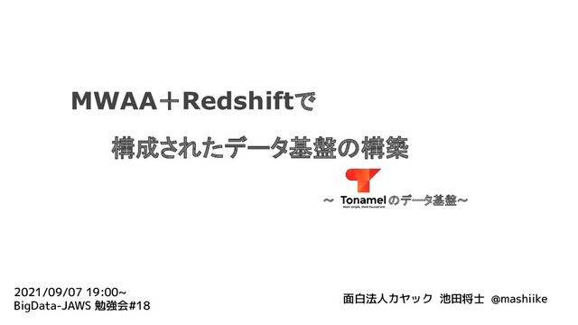 〜 のデータ基盤〜 MWAA+Redshiftで 構成されたデータ基盤の構築 2021/09/07 19:00~ BigData-JAWS 勉強会#18 面白法人カヤック 池田将士