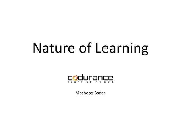 Learning is a part of our survival and key to professional success. Understanding its nature helps us to become better learners. In our industry, where technologies and practices evolve so fast, effective learning is an absolute necessity. I explore the nature of learning from learning styles to the tools that we use to learn. I also discuss our motivation for learning and the importance of active learning. It is too important for us to simply stumble through, our approach to learning must be deliberate.