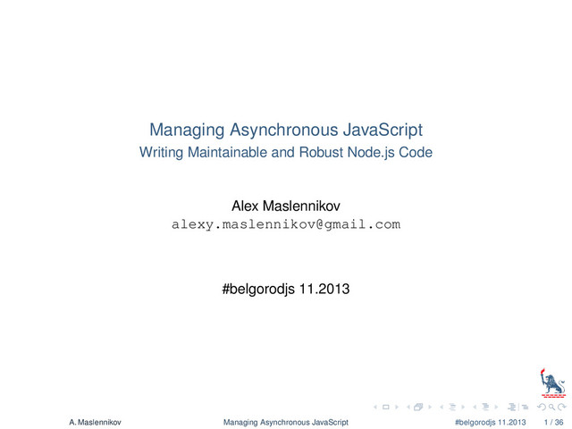become an unmanageable task There is a (huge) number of tools providing a convenient facility for writing asynchronous logic for node.js The community is revealing a growing tendency of using a generator-based approach. A. Maslennikov Managing Asynchronous JavaScript #belgorodjs 11.2013 34 / 36