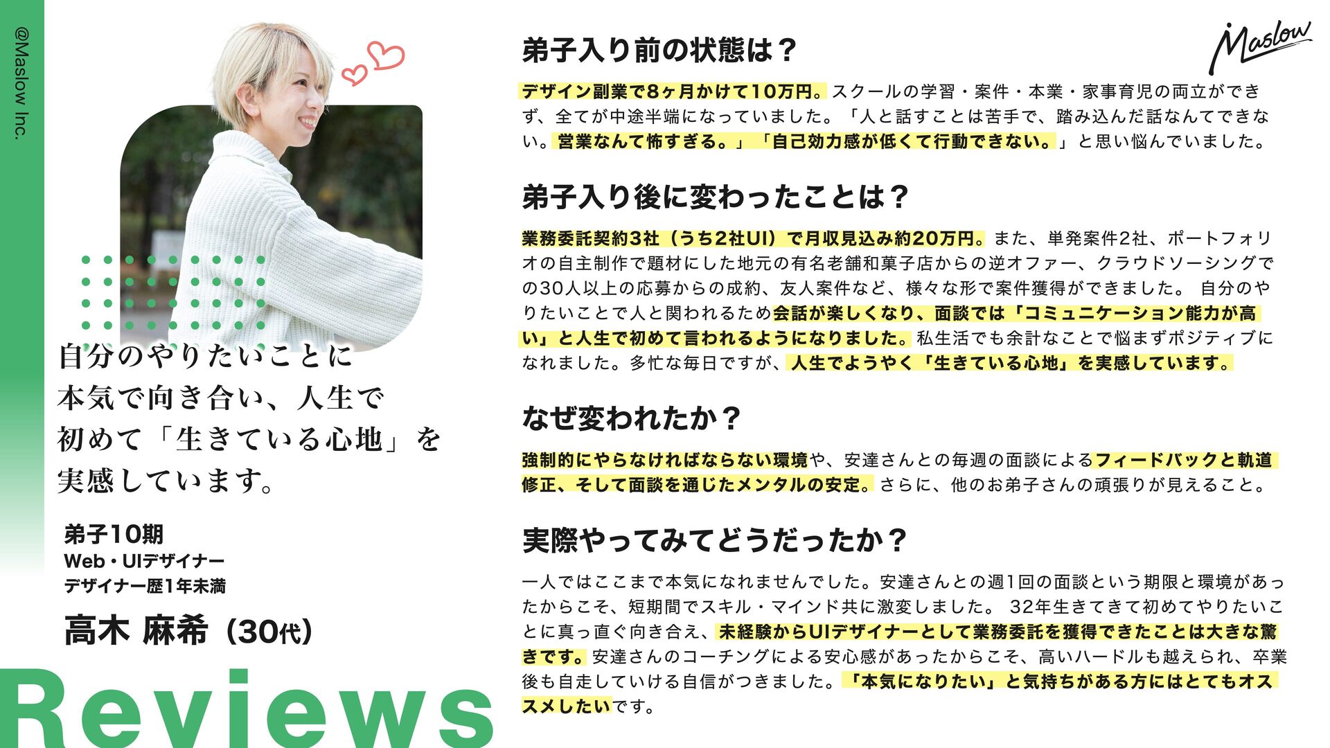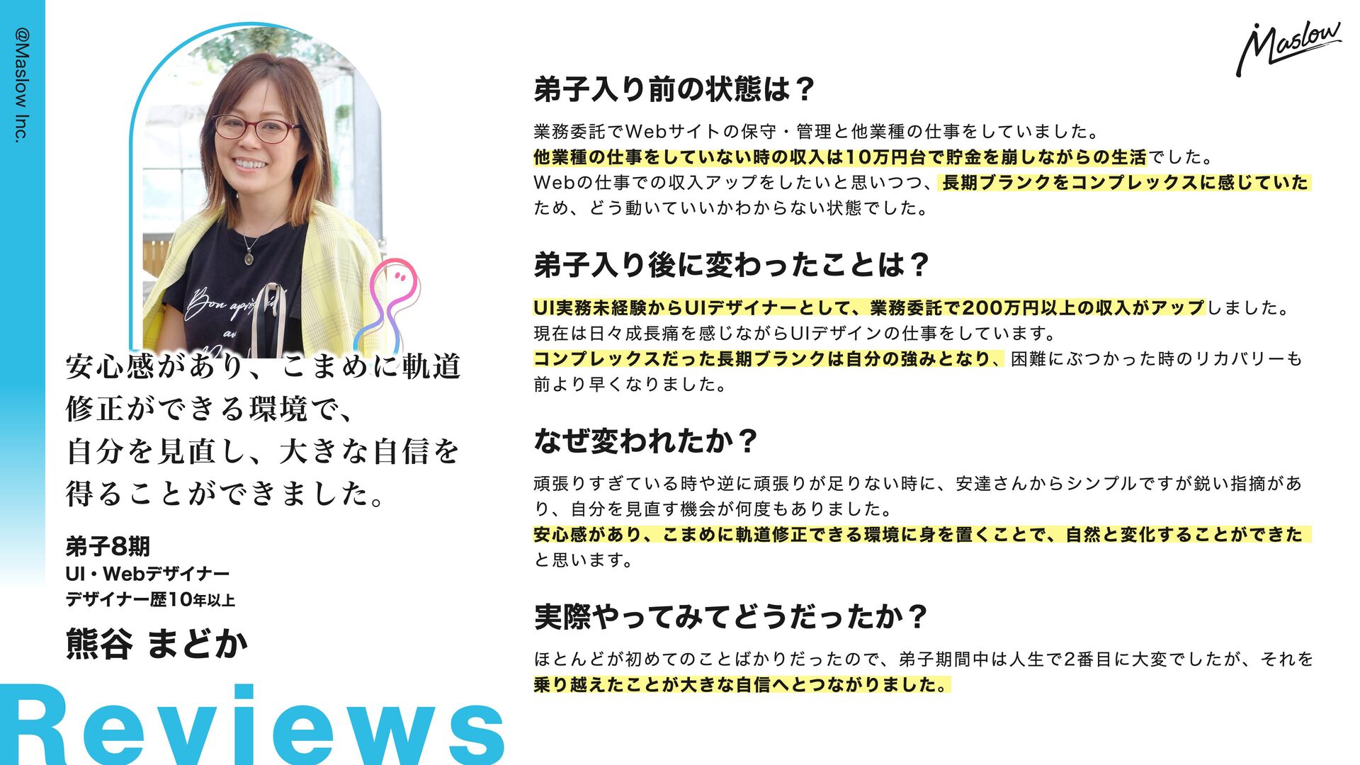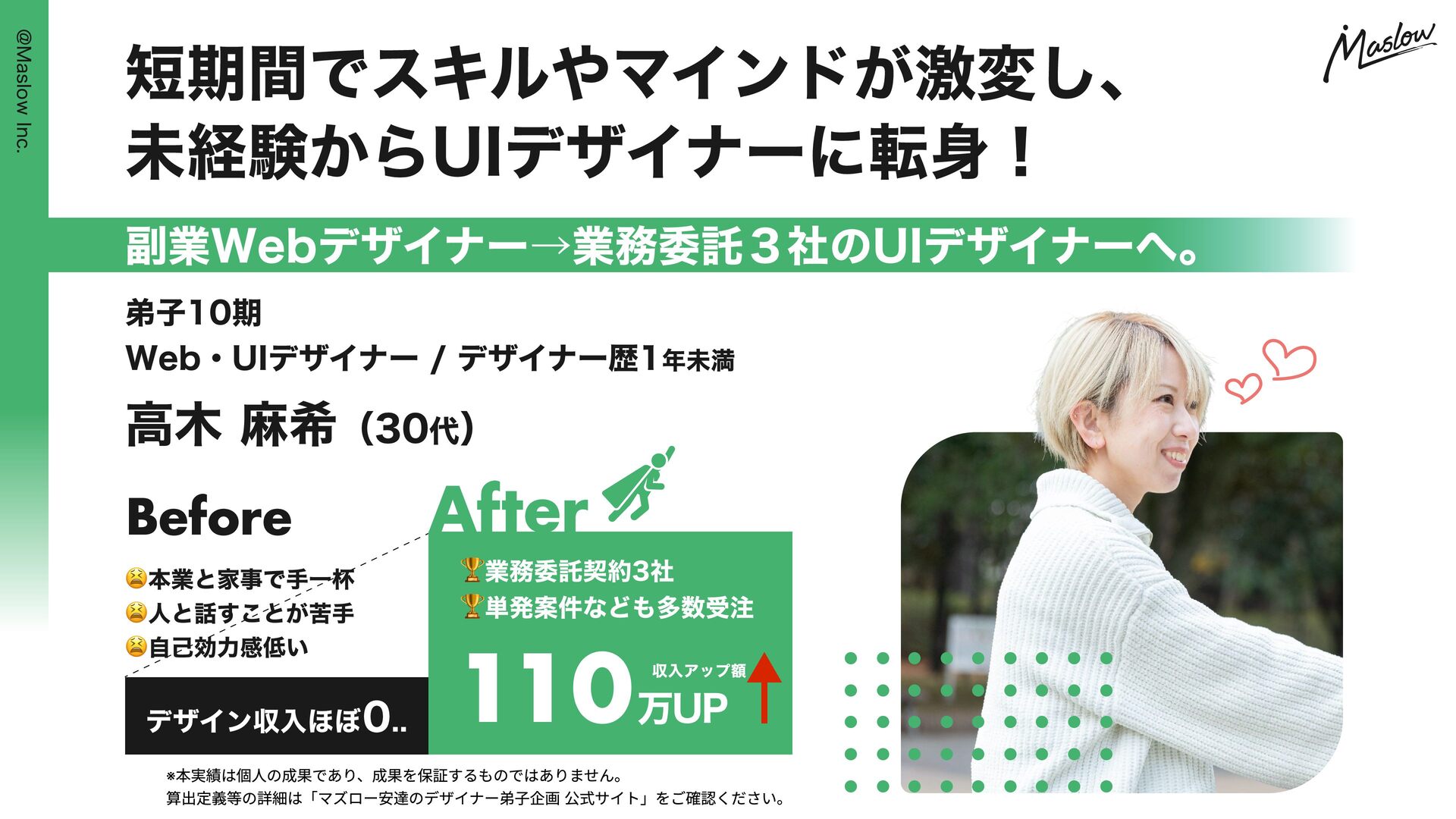 自信につながりました。 なぜ変われたか? We b De signe r 自分の決意もそうですが、何もわからない私に対して根気強く教えてくれた。 After Webデザイナーとして活躍 3ヶ月後 55万受注 合 計 受 注 額 Before 完全初心者 S U Z U N A H I G A 何もかも初めての状態で、 ツールも一切使った事ない UIデザイナーとして 業務委託メンバーに ※本実績は個人の成果であり、成果を保証するものではありません。 算出定義等の詳細は「マズロー安達のデザイナー弟子企画 公式サイト」をご確認ください。